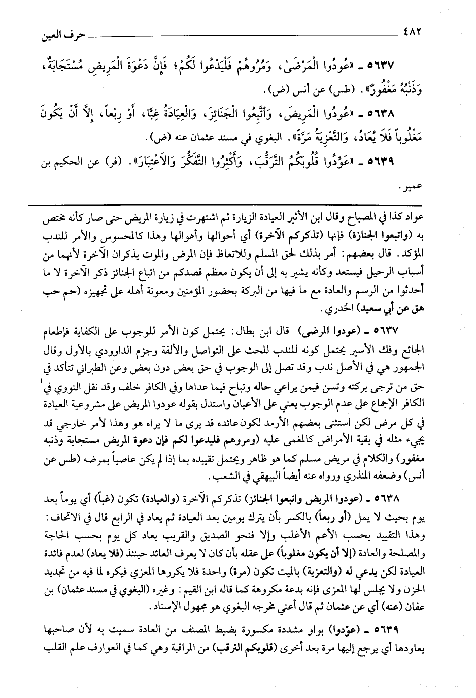 5637 - (عودوا المرضى) قال ابن بطال : يحتمل كون الأمر للوجوب على الكفاية فإطعام الجائع وفك الأسير يحتمل كونه للندب للحث على التواصل والألفة وجزم الداودي بالأول وقال الجمهور : هي في الأصل ندب وقد تصل إلى الوجوب في حق بعض دون بعض وعن الطبراني تتأكد في حق من ترجى بركته وتسن فيمن يراعي حاله وتباح فيما عداهما وفي الكافر خلف وقد نقل النووي في الكافر الإجماع على عدم الوجوب يعني على الأعيان واستدل بقوله عودوا المريض على مشروعية العيادة في كل مرض لكن استثنى بعضهم الأرمد لكون عائده قد يرى ما لا يراه هو وهذا لأمر خارجي قد يجئ مثله في بقية الأمراض كالمغمى عليه (ومروهم فليدعوا لكم فإن دعوة المريض مستجابة وذنبه مغفور) والكلام في مريض مسلم كما هو ظاهر ويحتمل تقييده بما إذا لم يكن عاصيا بمرضه.