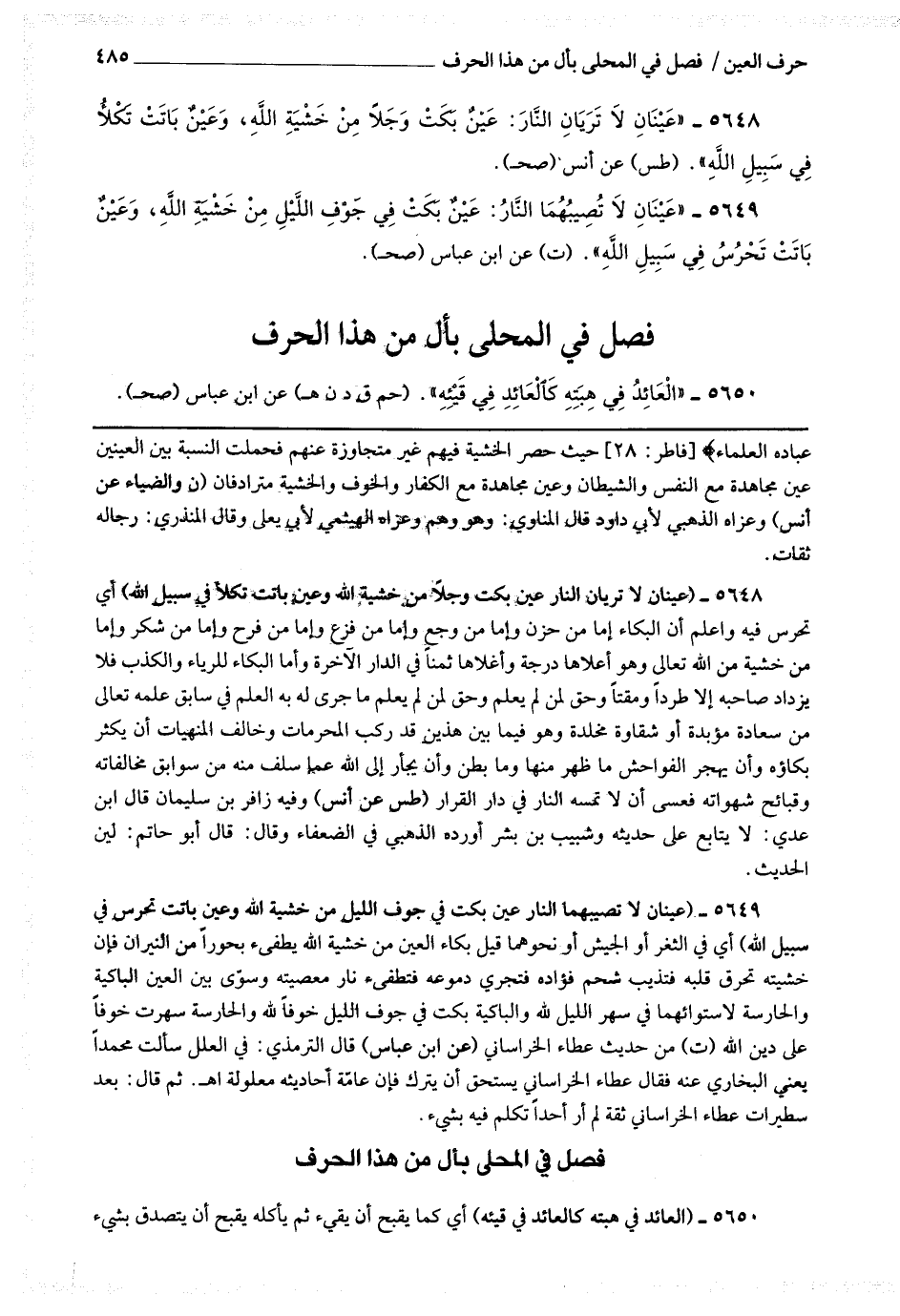 5648 - (عينان لا تريان النار عين بكت وجلا من خشية الله وعين باتت تكلأ في سبيل الله) أي تحرس فيه وأعلم أن البكاء إما من حزن وإما من وجع وإما من فزع وإما فرح وإما من شكر وإما من خشية من الله تعالى وهو أعلاها درجة وأغلاها ثمنا في الدار الآخرة وأما البكاء للرياء والكذب فلا يزداد صاحبه إلا طردا ومقتا وحق لمن لم يعلم وحق لمن لم يعلم ما جرى له به العلم في سابق علمه تعالى من سعادة مؤبدة أو شقاوة مخلدة وهو فيما بين هذين قد ركب المحرمات وخالف المنهيات أن يكثر بكاؤه وأن يهجر الفواحش ما ظهر منها وما بطن وأن يجأر إلى الله عما سلف منه من سوابق مخالفاته وقبائح شهواته فعسى أن لا تمسه النار في دار القرار.