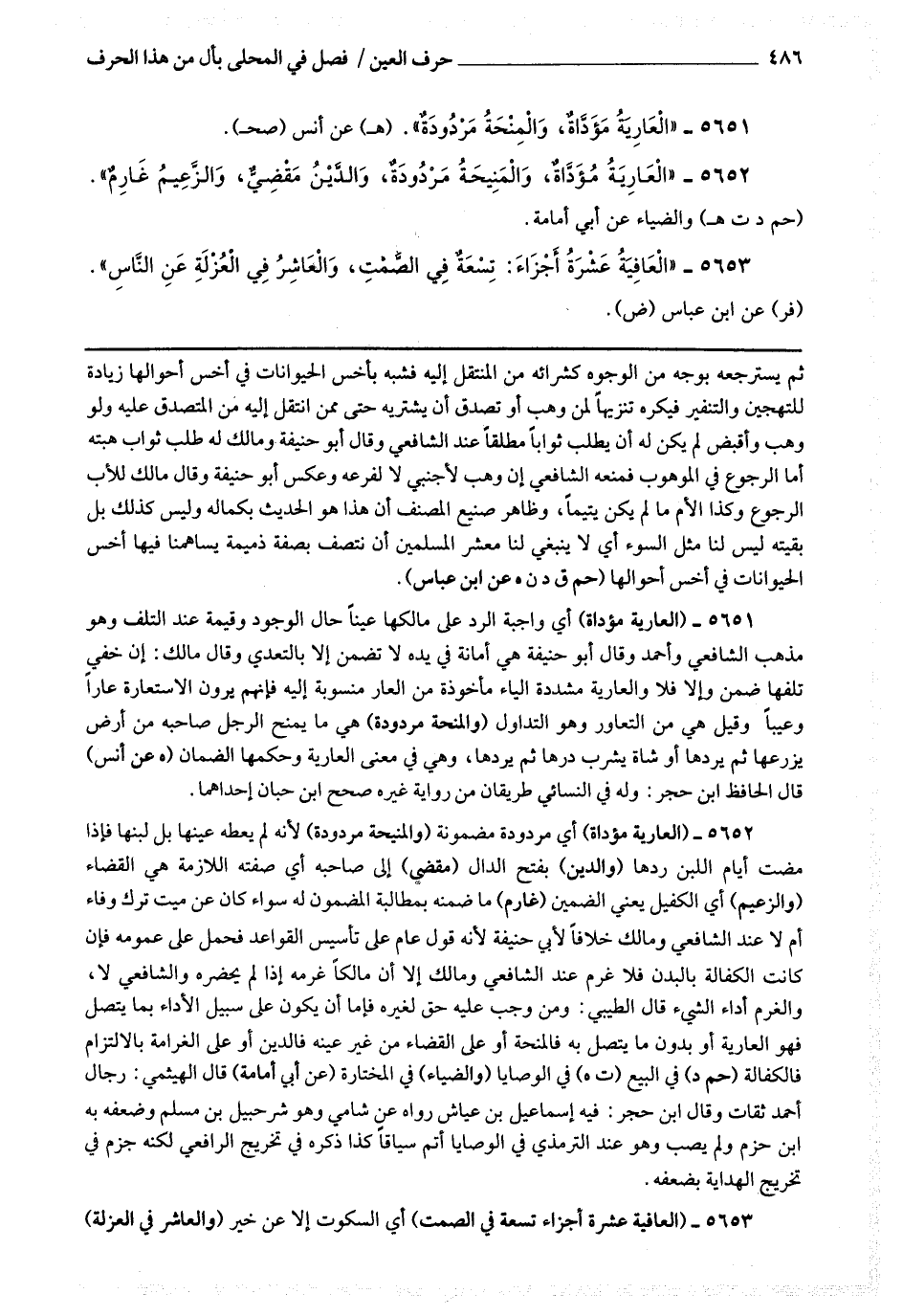 5651 - (العارية مؤداة) أي واجبة الرد على مالكها عينا حال الوجود وقيمة عند التلف وهو مذهب الشافعي وأحمد وقال أبو حنيفة : هي أمانة في يده لا تضمن إلا بالتعدي وقال مالك : إن خفي تلفها ضمن وإلا فلا والعارية مشددة الياء مأخوذة من العار منسوبة إليه فإنهم يرون الاستعارة عارا وعيبا وقيل هي من التعاور وهو التداول (والمنحة مردودة) هي ما يمنح الرجل صاحبه من أرض يزرعها ثم يردها أو شاة يشرب درها ثم يردها ، وهي في معنى العارية وحكمها الضمان.