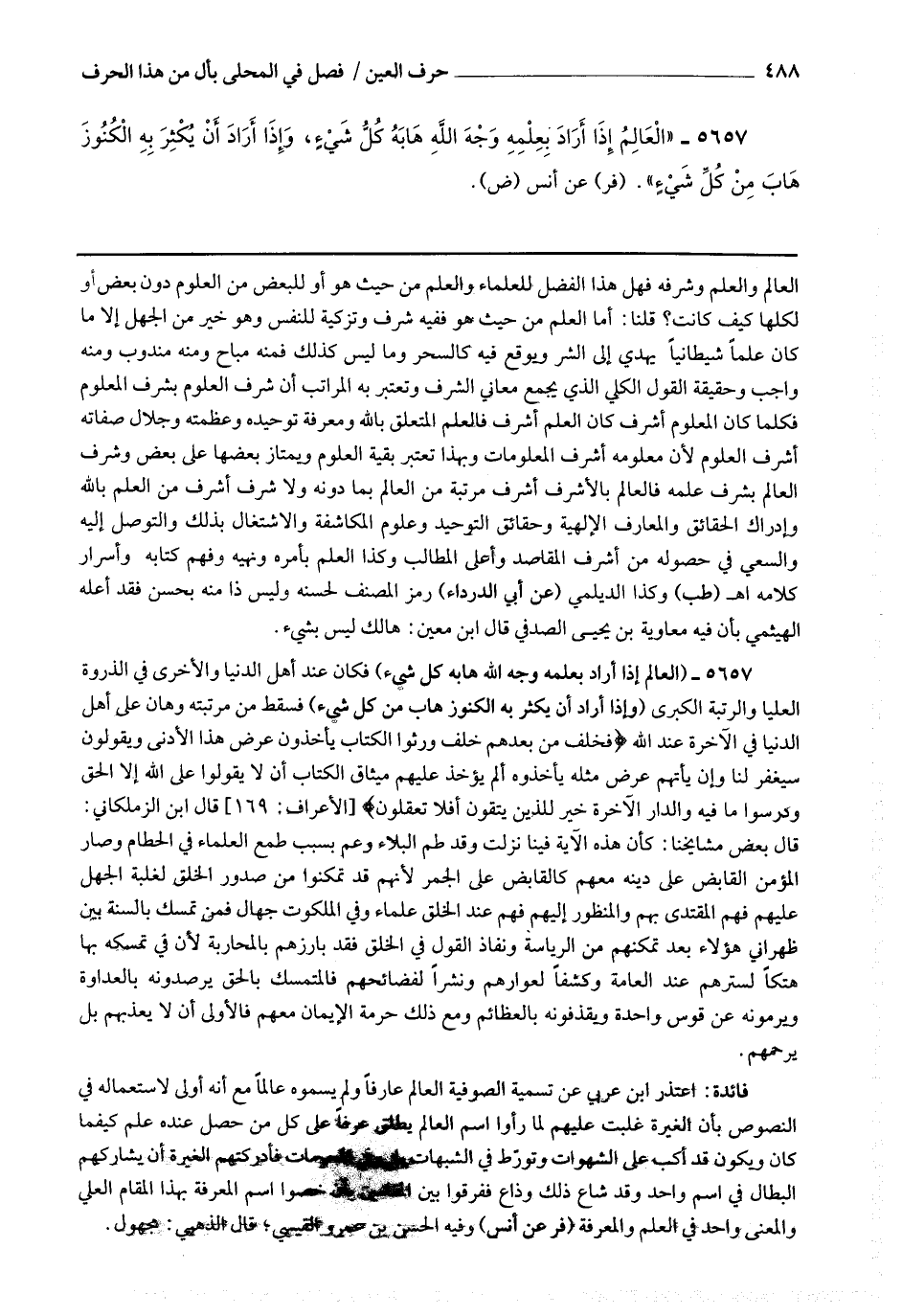 العالم والعلم وشرفه فهل هذا الفضل للعلماء والعلم من حيث هو أو للبعض من العلوم دون بعض أو لكلها كيف كانت ؟ قلنا أما العلم من حيث هو ففيه شرف وتزكية للنفس وهو خير من الجهل إلا ما كان علما شيطانيا يهدي إلى الشر ويوقع فيه كالسحر وما ليس كذلك فمنه مباح ومنه مندوب ومنه واجب وحقيقة القول الكلي الذي يجمع معاني الشرف وتعتبر به المراتب أن شرف العلوم بشرف المعلوم فكلما كان المعلوم أشرف كان العلم أشرف فالعلم المتعلق بالله ومعرفة توحيده وعظمته وجلال صفاته أشرف العلوم لأن معلومه أشرف المعلومات وبهذا تعتبر بقية العلوم ويمتاز بعضها على بعض وشرف العالم بشرف علمه فالعالم بالأشرف أشرف مرتبة من العالم بما دونه ولا شرف أشرف من العلم بالله وإدراك الحقائق والمعارف الإلهية وحقائق التوحيد وعلوم المكاشفة والاشتغال بذلك والتوصل إليه والسعي في حصوله من أشرف المقاصد وأعلى المطالب وكذا العلم بأمره ونهيه وفهم كتابه وأسرار كلامه اه.