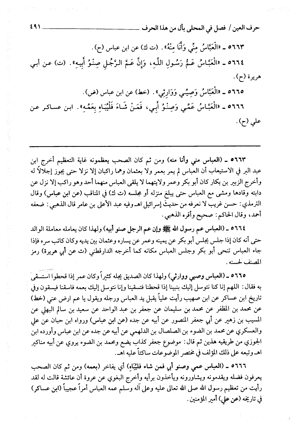 5663 - (العباس مني وأنا منه) ومن ثم كان الصحب يعظمونه غاية التعظيم أخرج ابن عبد البر في الاستيعاب أن العباس لم يمر بعمر ولا بعثمان وهما راكبان إلا نزلا حتى يجوز إجلالا له وأخرج الزبير بن بكار كان أبو بكر وعمر ولايتهما لا يلقى العباس منهما أحد وهو راكب إلا نزل عن دابته وقادها ومشى مع العباس حتى يبلغ منزله أو مجلسه.