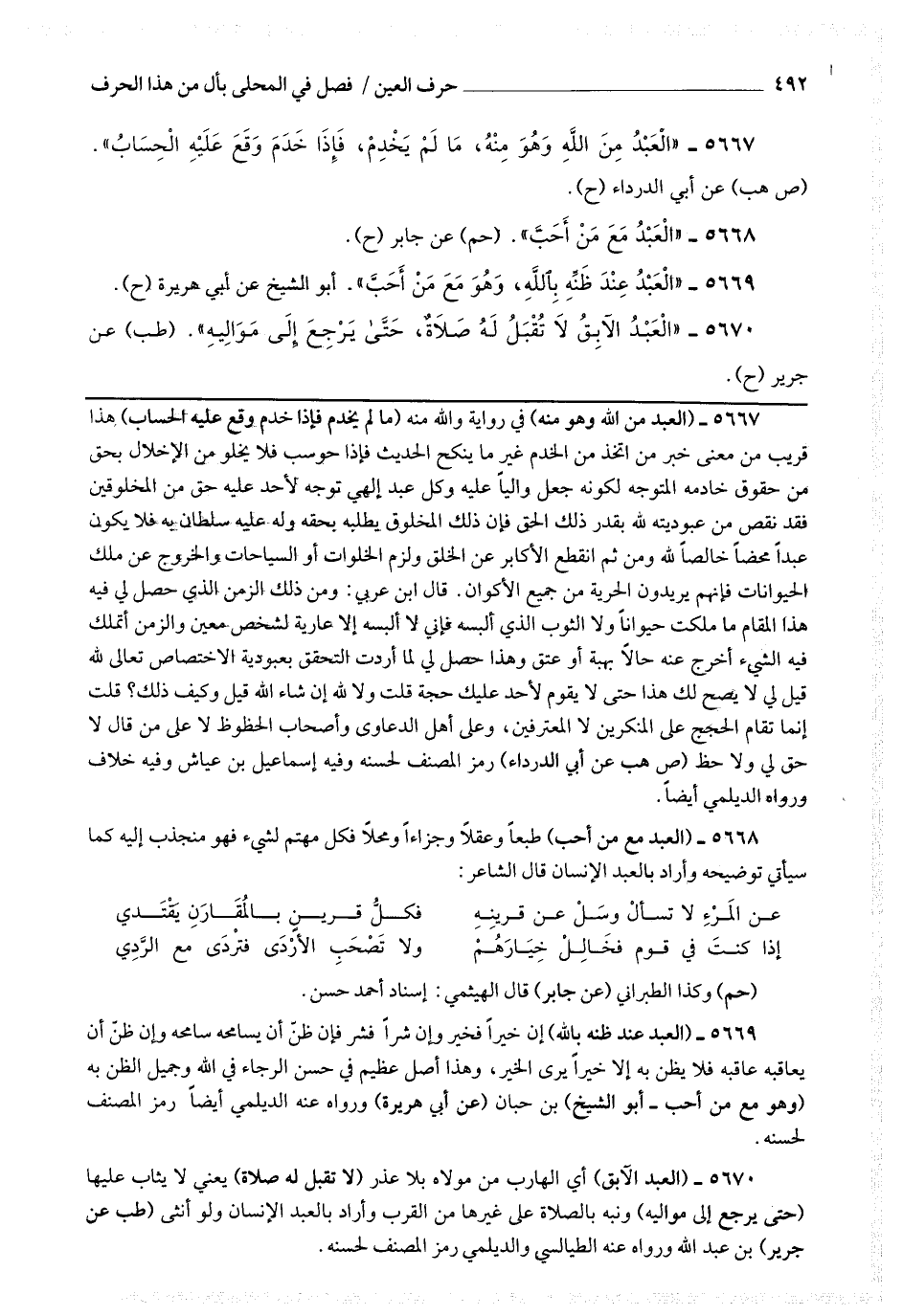 5667 - (العبد من الله وهو منه) وفي رواية والله منه (ما لم يخدم فإذا خدم وقع عليه الحساب) هذا قريب من معنى خير من اتخذ من الخدم غير ما ينكح الحديث فإذا حوسب فلا يخلو من الإخلال بحق من حقوق خادمه المتوجه لكونه جعل واليا عليه وكل عبد إلهي توجه لأحد عليه حق من المخلوقين فقد نقص من عبوديته لله بقدر ذلك الحق فإن ذلك المخلوق يطلبه بحقه وله عليه سلطان به فلا يكون عبدا محضا خالصا لله ومن ثم انقطع الأكابر عن الخلق ولزم الخلوات أو السياحات والخروج عن ملك الحيوانات فإنهم يريدون الحرية من جميع الأكوان.