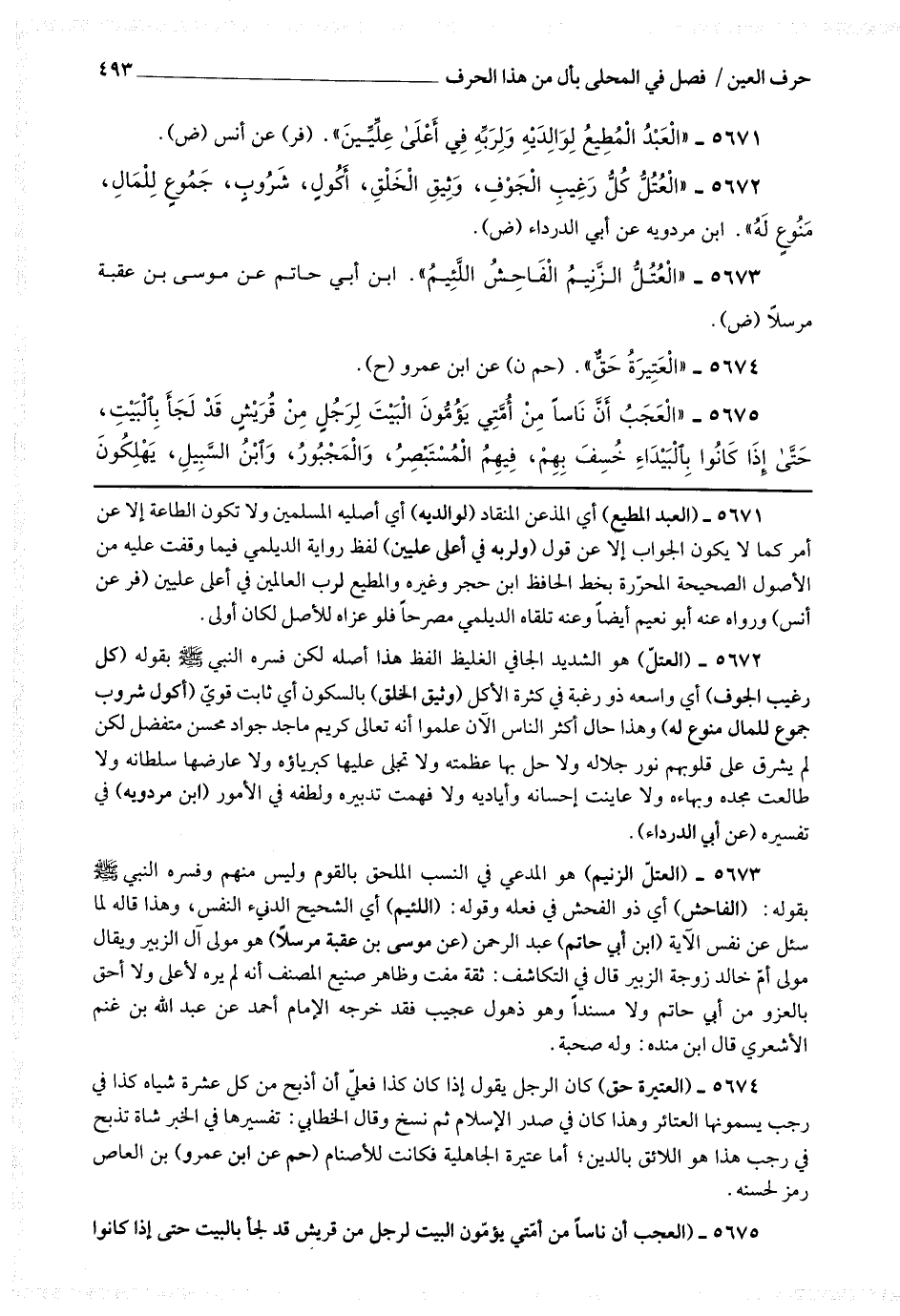 5673 - (العتل الزنيم) هو المدعي في النسب الملحق بالقوم وليس منهم وفسره النبي صلى الله عليه وسلم بقوله (الفاحش) أي ذو الفحش في فعله وقوله (اللئيم) أي الشحيح الدنئ النفس ، وهذا قاله لما سئل عن نفس الآية.