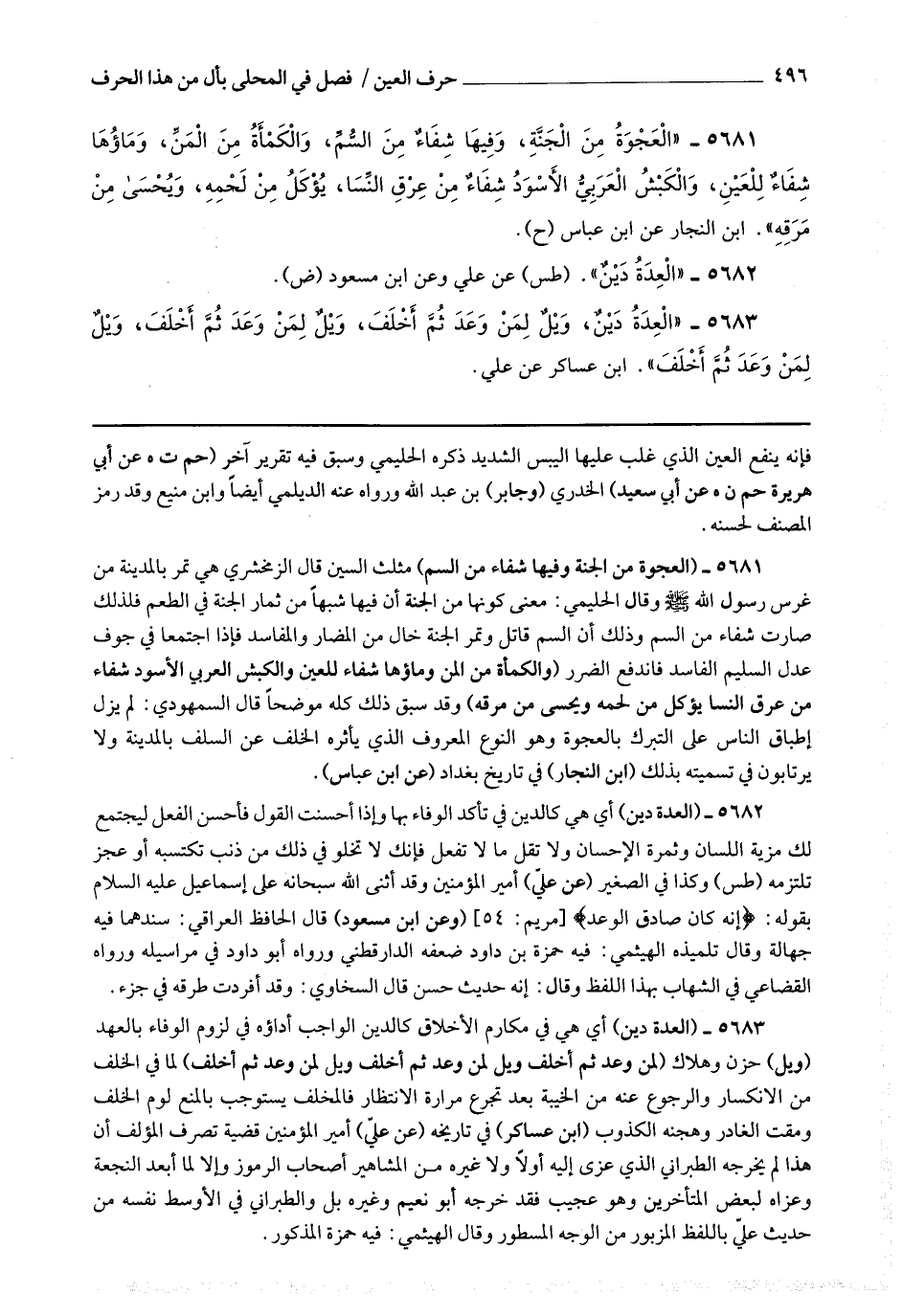 5681 - (العجوة من الجنة وفيها شفاء من السم) مثلث السين قال الزمخشري : هي تمر بالمدينة من غرس رسول الله صلى الله عليه وسلم.