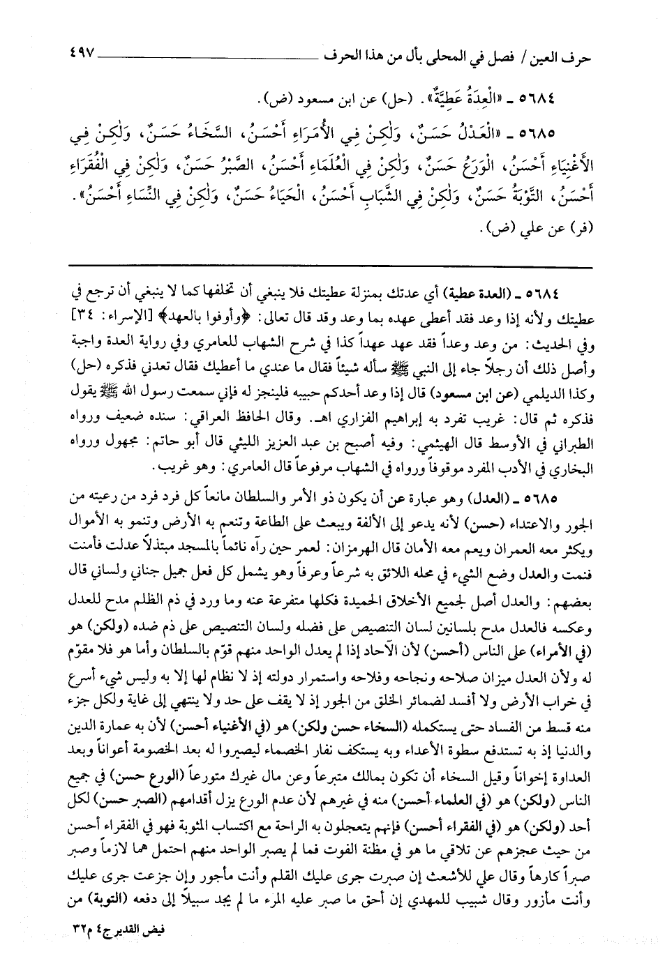 5685 - (العدل) وهو عبارة عن أن يكون ذو الأمر والسلطان مانعا كل فرد من رعيته من الجور والاعتداء (حسن) لأنه يدعو إلى الألفة ويبعث على الطاعة وتنعم به الأرض وتنمو به الأموال ويكثر معه العمران ويعم معه الأمان قال الهرمزان لعمر حين رآه نائما بالمسجد مبتذلا : عدلت فأمنت فنمت.
