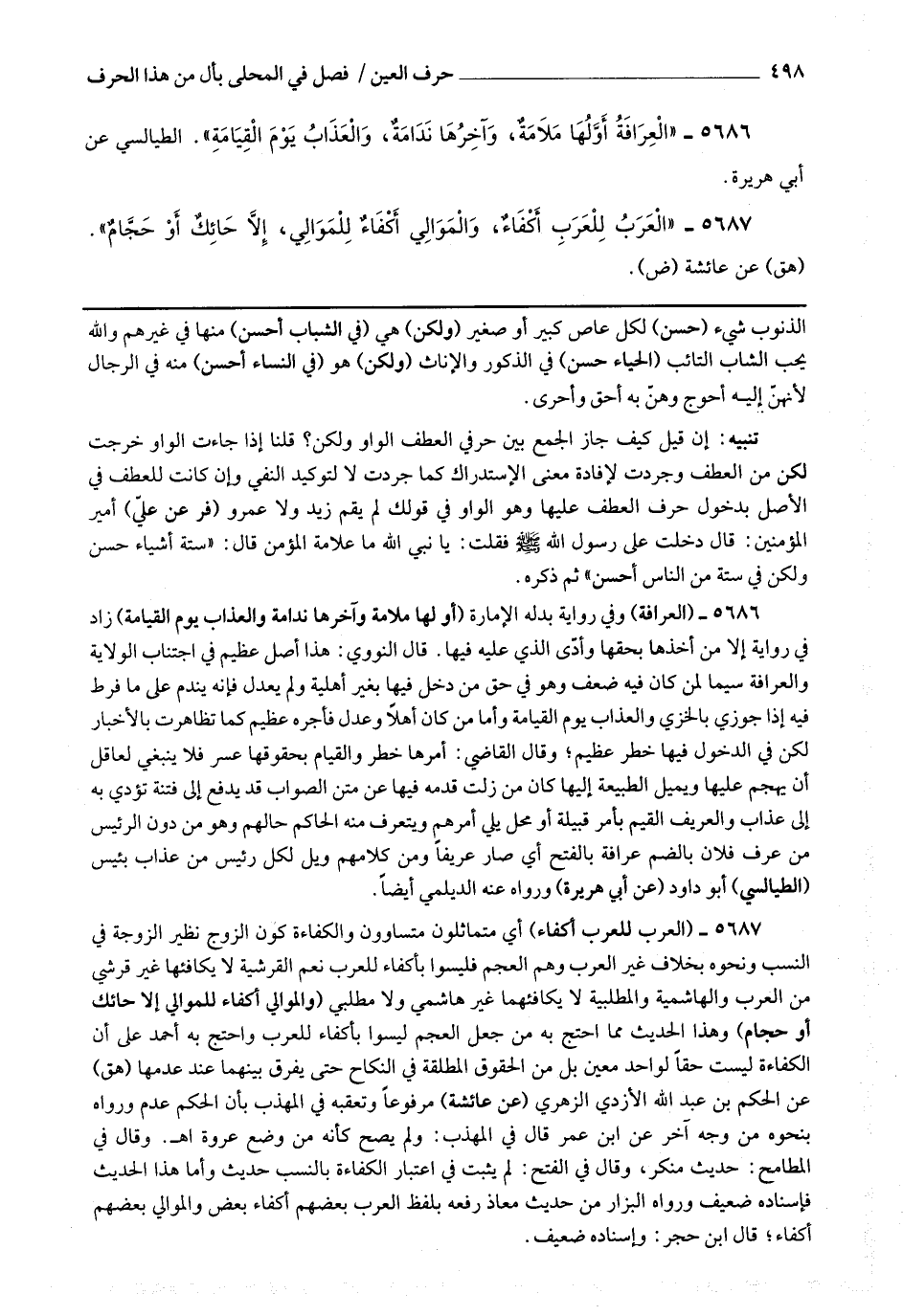5687 - (العرب للعرب أكفاء) أي متماثلون متساوون والكفاءة كون الزوج نظير الزوجة في النسب ونحوه بخلاف غير العرب وهم العجم فليسوا أكفاء للعرب نعم القرشية لا يكافئها غير قرشي من العرب والهاشمية والمطلبية لا يكافئها غير هاشمي ولا مطلبي (والموالي أكفاء للموالي إلا حائك أو حجام) وهذا الحديث مما احتج به من جعل العجم ليسوا بأكفاء للعرب واحتج به أحمد على الكفاءة ليست حقا لواحد معين بل من الحقوق المطلقة في النكاح حتى يفرق بينهم عند عدمها.