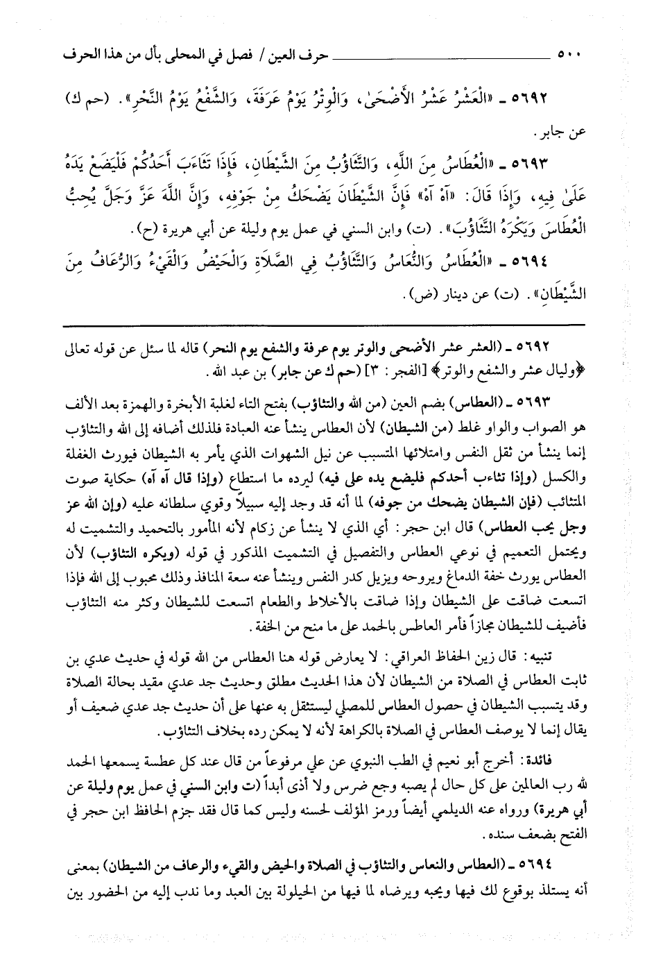 5694 - (العطاس والنعاس والتثاؤب في الصلاة والحيض والقئ والرعاف من الشيطان) بمعنى أنه يستلذ بوقوع لك فيها ويحبه ويرضاه لما فيها من الحيلولة بين العبد وما ندب إليه من الحضور بين
