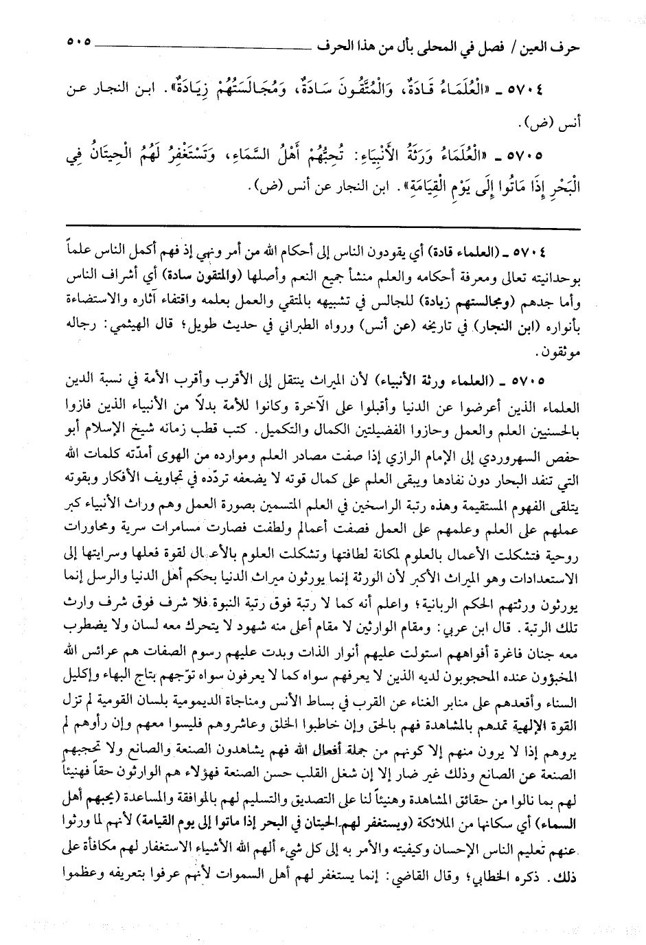 5705 - (العلماء ورثة الأنبياء) لأن الميراث ينتقل إلى الأقرب وأقرب الأمة في نسبة الدين العلماء الذين أعرضوا عن الدنيا وأقبلوا على الآخرة وكانوا للأمة بدلا من الأنبياء الذين فازوا بالحسنيين العلم والعمل وحازوا الفضيلتين الكمال والتكميل.