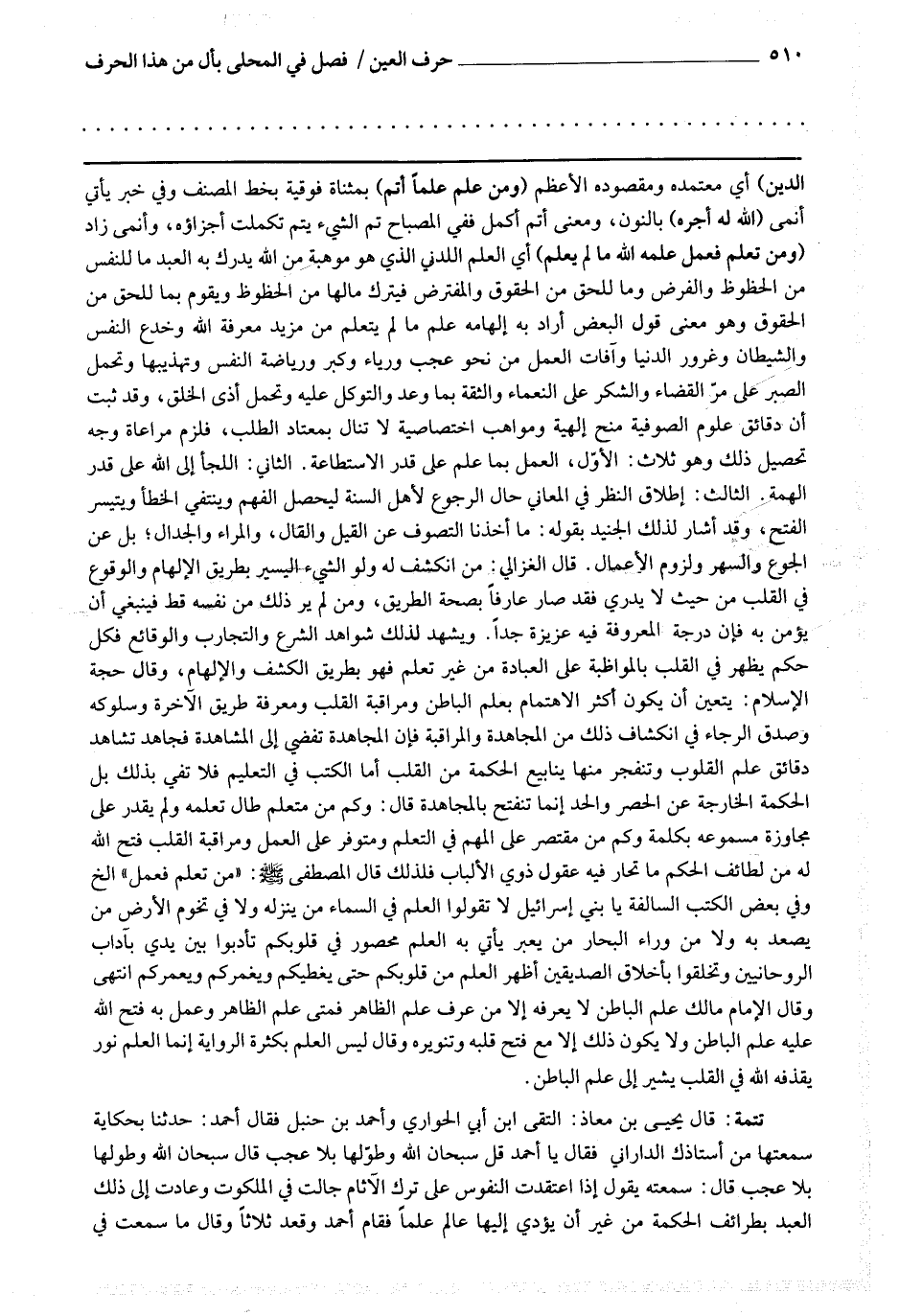 قال الغزالي : من انكشف له ولو الشئ اليسير بطريق الإلهام والوقوع في القلب من حيث لا يدري فقد صار عارفا بصحة الطريق ، ومن لم ير ذلك من نفسه قط فينبغي أن يؤمن به فإن درجة المعرفة فيه عزيزة جدا ، ويشهد لذلك شواهد الشرع والتجارب والوقائع فكل حكم يظهر في القلب بالمواظبة على العبادة من غير تعلم فهو بطريق الكشف والإلهام ، وقال حجة الإسلام : يتعين أن يكون أكثر الاهتمام بعلم الباطن ومراقبة القلب ومعرفة طريق الآخرة وسلوكه وصدق الرجاء في انكشاف ذلك من المجاهدة والمراقبة فإن المجاهدة تفضي إلى المشاهدة فجاهد تشاهد دقائق علم القلوب وتنفجر منها ينابيع الحكمة من القلب أما الكتب في التعليم فلا تفي بذلك بل الحكمة الخارجة عن الحصر الخارجة عن الحصر والحد إنما تنفتح بالمجاهدة قال : وكم من متعلم طال تعلمه ولم يقدر على مجاوزة مسموعه بكلمة وكم من مقتصر على المهم في التعلم ومتوفر على العمل ومراقبة القلب فتح الله له من لطائف الحكم ما تحار فيه عقول ذوي الألباب فلذلك قال المصطفى صلى الله عليه وسلم من تعلم فعمل إلخ وفي بعض الكتب السالفة يا بني إسرائيل لا تقولوا العلم في السماء من ينزله ولا في تخوم الأرض من يصعد به ولا من وراء البحار من يعبر يأتي به العلم محصور في قلوبكم تأدبوا بين يدي بآداب الروحانيين وتخلقوا بأخلاق الصديقين أظهر العلم من قلوبكم حتى يغطيكم ويغمركم ويعمركم انتهى.