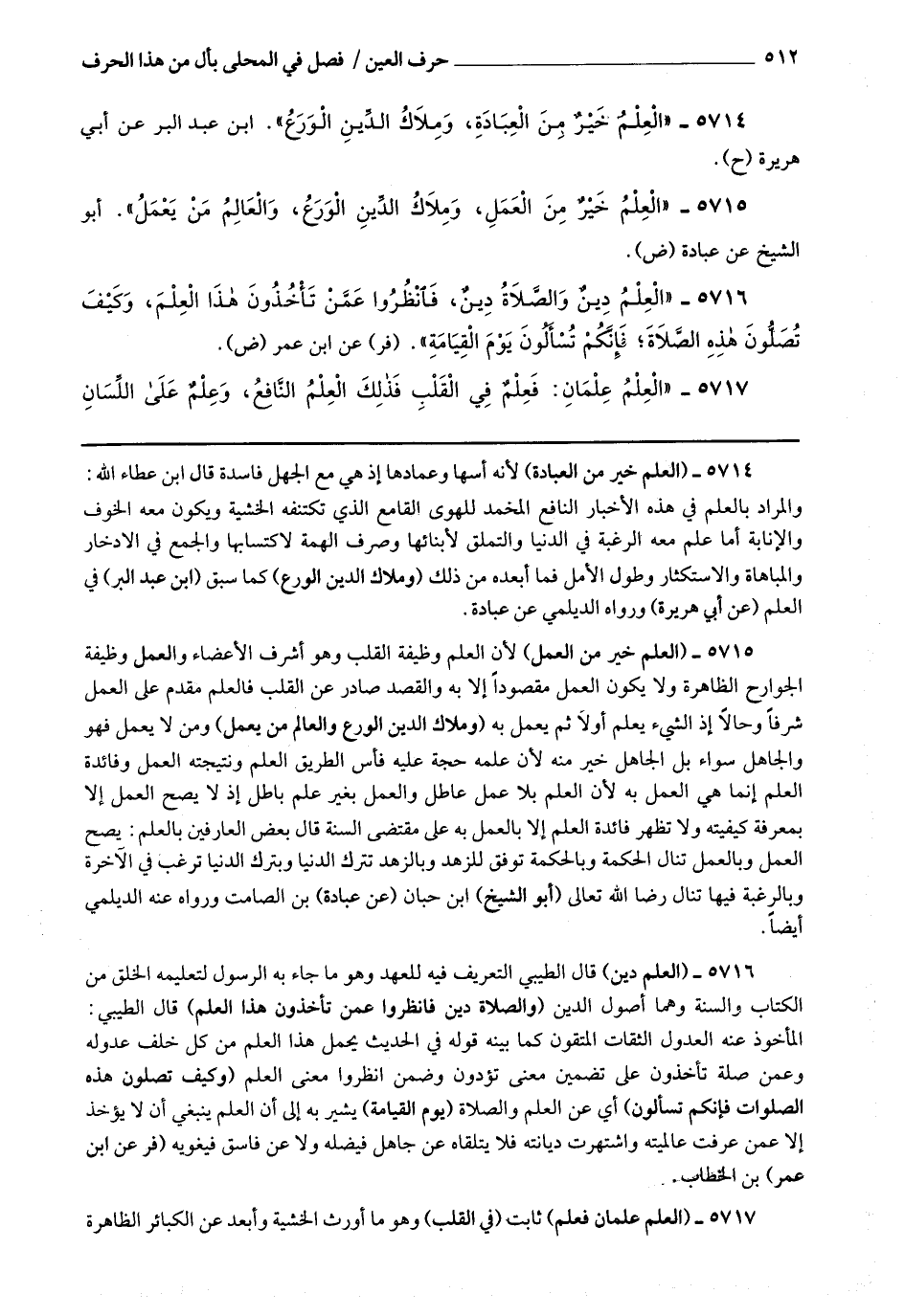5717 - (العلم علمان فعلم) ثابت (في القلب) وهو ما أورث الخشية وأبعد عن الكبائر الظاهرة