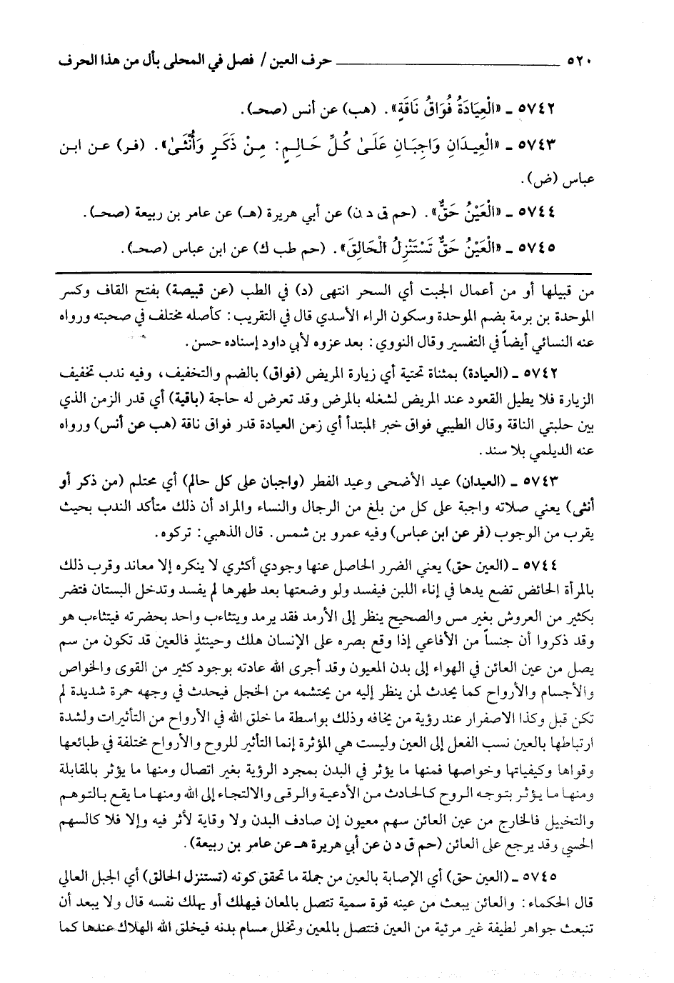 5744 - (العين حق) يعني الضرر الحاصل عنها وجودي أكثري لا ينكره إلا معاند وقرب ذلك بالمرأة الحائض تضع يدها في إناء اللبن فيفسد ولو وضعتها بعد طهرها لم يفسد وتدخل البستان فتضر بكثير من العروش بغير مس والصحيح ينظر إلى الأرمد فقد يرمد ويتثاءب واحد بحضرته فيتثاءب هو وقد ذكروا أن جنسا من الأفاعي إذا وقع بصره على الإنسان هلك وحينئذ فالعين قد تكون من سم يصل من عين العائن في الهواء إلى بدن المعيون وقد أجرى الله عادته بوجود كثير من القوى والخواص