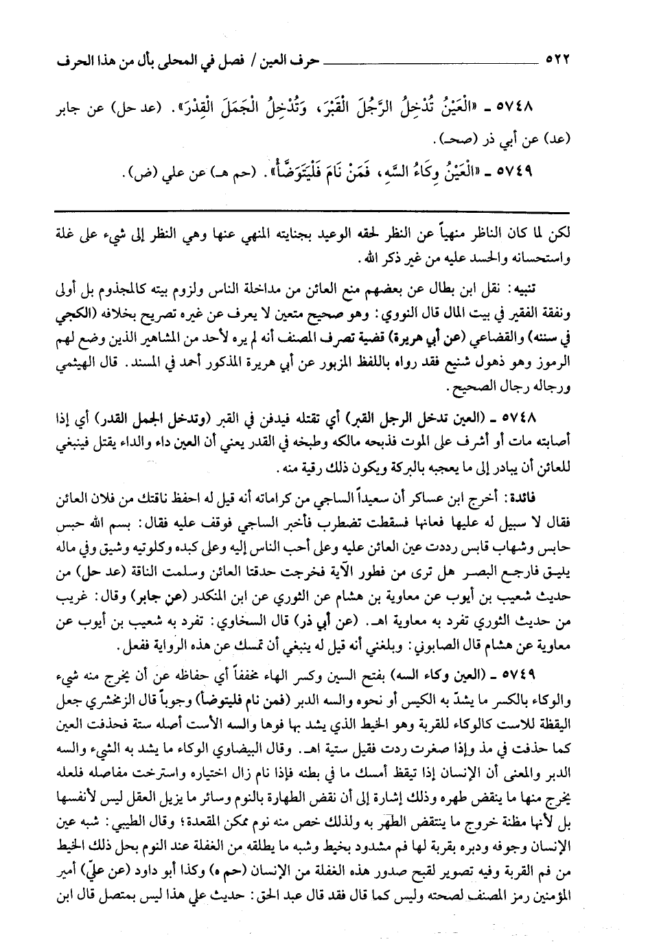 5748 - (العين تدخل الرجل القبر) أي تقتله فيدفن في القبر (وتدخل الجمل القدر) أي إذا أصابته مات أو أشرف على الموت فذبحه مالكه وطبخه في القدر يعني أن العين داء والداء يقتل فينبغي للعائن أن يبادر إلى ما يعجبه بالبركة ويكون ذلك رقية منه (فائدة) أخرج ابن عساكر أن سعيدا الساجي من كراماته أنه قيل له : احفظ ناقتك من فلان العائن فقال : لا سبيل له عليها فعانها فسقطت تضطرب فأخبر الساجي فوقف عليه فقال : بسم الله حبس حابس وشهاب قابس رددت عين العائن عليه وعلى أحب الناس إليه وعلى كبده وكلوتيه وشيق وفي ماله يليق فأرجع البصر هل ترى من فطور الآية فخرجت حدقنا العائن وسلمت الناقة.