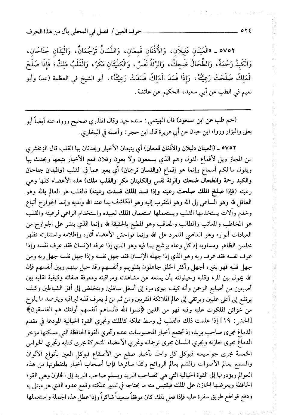 5752 - (العينان دليلان والأذنان قمعان) أي يتبعان الأخبار ويحدثان بها القلب قال الزمخشري : من المجاز ويل لأقماع القول وهم الذين يسمعون ولا يعون وفلان قمع الأخبار يتبعها ويحدث بها ويقول ما لكم أسماع وإنما هو إقماع (واللسان ترجمان) أي يعبر عما في القلب (واليدان جناحان والكبد رحمة والطحال ضحك والرئة نفس والكليتان مكر والقلب ملك) هذه الأعضاء كلها وهي رعيته (فإذا صلح الملك صلحت رعيته وإذا فسد الملك فسدت رعيته) فالقلب هو العالم بالله وهو العاقل لله وهو الساعي إلى الله وهو المتقرب إليه وهو المكاشف بما عند الله ولديه وإنما الجوارح أتباع وخدم وآلات يستخدمها القلب ويستعملها استعمال الملك لعبيده واستخدام الراعي لرعيته والقلب هو المخاطب والمعاتب والمطالب والمعاقب وهو المطيع بالحقيقة لله وإنما الذي ينشر على الجوارح من العبادات أنواره وهو العاصي المتمرد على الله وإنما فواحش الأعضاء آثاره وإظلامه واستنارته تظهر محاسن الظاهر ومساويه إذ كل وعاء يرشح بما فيه وهو الذي إذا عرفه الإنسان فقد عرف نفسه وإذا عرف نفسه فقد عرف ربه وهو الذي إذا جهله الإنسان فقد جهل نفسه وإذا جهل نفسه جهل ربه ومن جهل قلبه فهو بغيره أجهل وأكثر الخلق جاهلون بقلوبهم وأنفسهم وقد حيل بينهم وبين أنفسهم فإن الله يحول بين المرء وقلبه وحيلولته بأن يمنعه عن مشاهدته ومراقبته ومعرفة صفاته وكيفية تقلبه بين أصبعين من أصابع الرحمن وأنه كيف يهوي مرة إلى أسفل سافلين وينخفض إلى أفق الشياطين وكيف يرتفع إلى أعلى عليين ويرتقي إلى عالم الملائكة المقربين ومن ثم من لم يعرف قلبه ليراقبه ويترصد ما يلوح من خزائن الملكوت عليه وفيه فهو من الذين * (نسوا الله فأنساهم أنفسهم أولئك هم الفاسقون) *