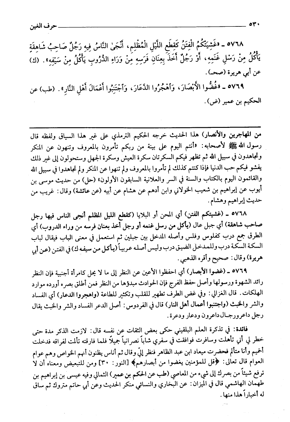 5768 - (غشيتكم الفتن) أي المحن أو البلايا (كقطع الليل المظلم أنجى الناس فيها رجل صاحب شاهقة) أي جبل عال (يأكل من رسل غنمه أو رجل أخذ بعنان فرسه من وراء الدروب) أي الطرق جمع درب كفلوس وفلس وأصله المدخل بين جبلين ثم استعمل في معنى الباب فيقال لباب السكة السكة درب وللمدخل الضيق درب وليس أصله عربيا (يأكل من سيفه).