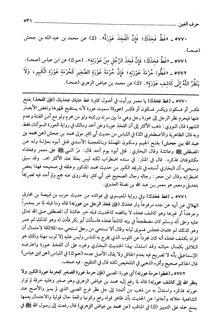 5770 - (غط فخذك) يا معمر ورأيت في أصول كثيرة غط عليك فخذيك (فإن الفخذ) بفتح فكسر أو فسكون ويكسر فسكون أو فكسر (عورة) سميت عورة لأنه يستقبح ظهرها وتغض الأبصار عنها فيحرم نظر الرجل إلى عورة رجل وهي ما بين سرته وركبته ولو من محرم ولو مع أمن الفتنة وعدم الشهوة قال النووي : ذهب الأكثر إلى أن الفخذ عورة وعن أحمد ومالك في رواية العورة السوأتان فقط