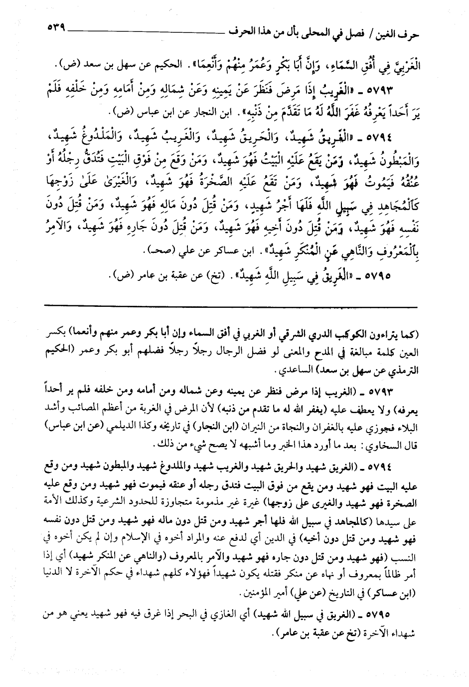 5794 - (الغريق شهيد والحريق شهيد والغريب شهيد والملدوغ شهيد والمبطون شهيد ومن وقع عليه البيت فهو شهيد ومن يقع من فوق البيت فتدق رجله أو عنقه فيموت فهو شهيد ومن وقع عليه الصخرة فهو شهيد والغيري على زوجها) غيرة غير مذمومة متجاوزة للحدود الشرعية وكذلك الأمة على سيدها (كالمجاهد في سبيل الله فلها أجر شهيد ومن قتل دون ماله فهو شهيد ومن قتل دون نفسه فهو شهيد ومن قتل دون أخيه) في الدين أي لدفع عنه والمراد أخوه في الإسلام وإن لم يكن أخوه في النسب (فهو شهيد ومن قتل دون جاره فهو شهيد والآمر بالمعروف والناهي عن المنكر شهيد) أي إذا أمر ظالما بمعروف أو نهاه عن منكر فقتله يكون شهيدا فهؤلاء كلهم شهداء في حكم الآخرة لا الدنيا.