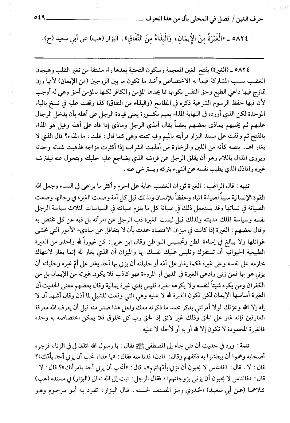 (تنبيه) قال الراغب : الغيرة ثوران الغضب حماية على الحرم وأكثر ما يراعى في النساء وجعل الله القوة الإنسانية سببا لصيانة المياه وحفظا للإنسان ولذلك قيل كل أمة وضعت الغيرة في رجالها وضعت الصيانة في نسائها وقد يستعمل ذلك في صيانة كل ما يلزم صيانته من السياسات الثلاث سياسة الرجل نفسه وسياسة الملك مدينته ولذلك قيل ليست الغيرة ذب الرجل عن امرأته بل ذبه عن كل مختص به وقال بعضهم : الغيرة إذا كانت في ميزان الاقتصاد حمدت بأن لا يتغافل عن مبادئ الأمور التي تخشى غوائلها ولا يبالغ في إساءة الظن وتجسيس البواطن وقال ابن عربي : كن غيورا لله واحذر من الغيرة الطبيعية الحيوانية أن تستفزك وتلبس عليك نفسك بها والميزان أن الذي يغار لله إنما يغار لانتهاك محارمه على نفسه وعلى غيره فكما يغار على أمه أو حليلته أن يزني بها أحد يغار على أم غيره وحليلته أن يزني هو بها فمن زنى وادعى الغيرة في الدين أو المروءة فهو كاذب فلا يكون غيرته من الإيمان بل من الكفران ومن يكره شيئا لنفسه ولا يكرهه لغيره فليس بذي غيرة إيمانية وقال بعضهم : معنى الحديث أن الغيرة أساسها الإيمان لكن تكون الغيرة لله لا عليه وهي التي وقعت للشبلي لما أذن وقال أشهد أن لا إله إلا الله وعزتك لولا أمرتني بذكر محمد ما ذكرته معك ولعل هذا صدر منه قبل أن يعرف الله معرفة العارفين فإنه غار على الحق وذلك غير لائق إذ الحق رب كل مخلوق فلا يمكن اختصاصه به وحده فالغيرة المحمودة لا تكون إلا لله أو به أو لأجله لا عليه.