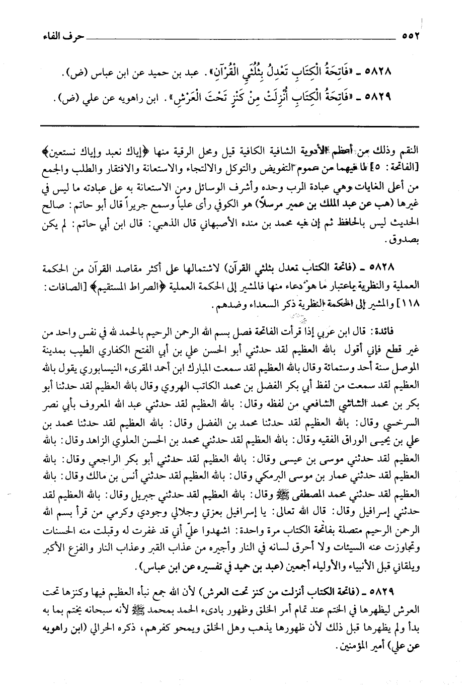 5829 - (فاتحة الكتاب أنزلت من كنز تحت العرش) لأن الله جمع نبأه العظيم فيها وكنزها تحت العرش ليظهرها في الختم عند تمام أمر الخلق وظهور بادئ الحمد بمحمد صلى الله عليه وسلم لأنه سبحانه وتعالى يختم بما به بدأ ولم يظهرها قبل ذلك لأن ظهورها يذهب وهل الخلق ويمحو كفرهم.
