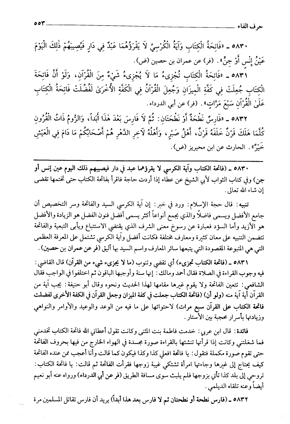 5830 - (فاتحة الكتاب وآية الكرسي لا يقرؤهما عبد في دار فيصيبهم في ذلك اليوم عين إنس أو جن) وفي كتاب الثواب لأبي الشيخ عن عطاء إذا أردت حاجة فاقرأ بفاتحة الكتاب حتى تختمها تقضى إن شاء الله تعالى (تنبيه) قال حجة الإسلام : ورد في خبر إن آية الكرسي السيد والفاتحة وسر التخصيص أن جامع الأفضل ويسمى فاضلا والذي يجمع أنواعا أكثر يسمى أفضل فنون الفضل هو الزيادة والأفضل هو الأزيد وأما السؤد فعبارة عن رسوخ معنى الشرف الذي يقتضي الاستتباع ويأبى التبعية والفاتحة تتضمن التنبيه عن معان كثيرة ومعارف مختلفة فكانت أفضل وآية الكرسي تشتمل على المعرفة العظمى التي هي المتبوعة المقصودة التي يتبعها سائر المعارف واسم السيد بها أليق.