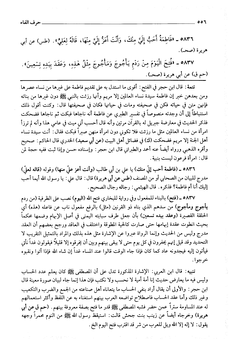 (تتمة) قال ابن حجر في الفتح : أقوى ما استدل به على تقديم فاطمة على غيرها من نساء عصرها ومن بعدهن خبر إن فاطمة سيدة نساء العالمين إلا مريم وأنها رزئت بالنبي صلى الله عليه وسلم دون غيرها من بناته فإنهن متن في حياته فكن في صحيفته ومات في حياتها فكان في صحيفتها قال : وكنت أقول ذلك استنباطا إلى أن وجدته منصوصا في تفسيره الطبري عن فاطمة أنه ناجاها فبكت ثم ناجاها فضحكت فذكر الحديث في معارضة جبريل له القرآن مرتين وأنه قال : أحسب أني ميت في عامي هذا وأنه لم ترزأ امرأة من نساء العالمين مثل ما رزئت فلا تكوني دون امرأة منهن صبرا فبكت فقال : أنت سيدة نساء أهل الجنة إلا مريم فضحكت.