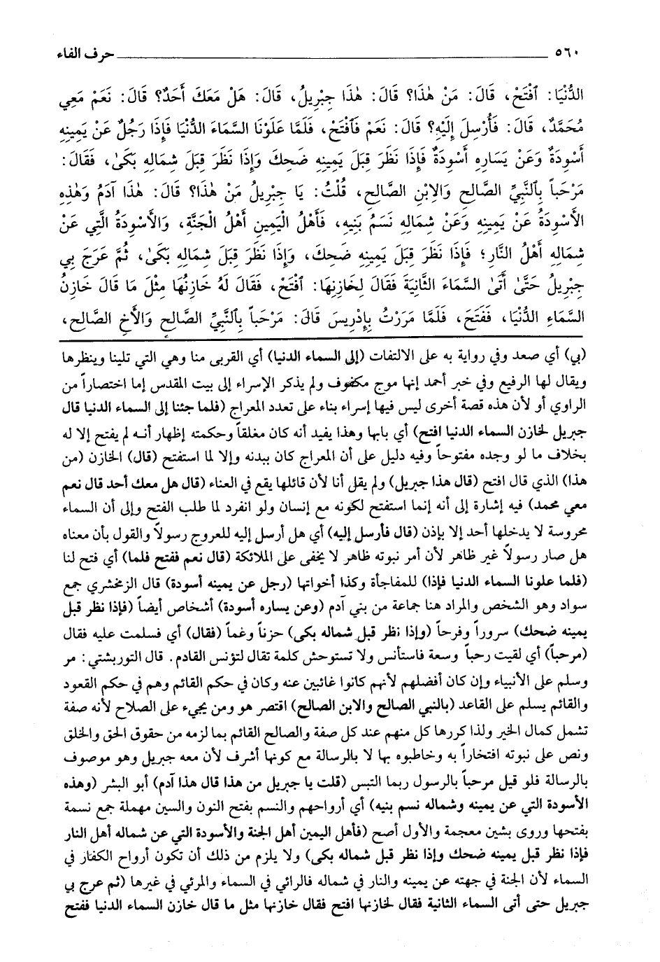 (بي) أي صعد وفي رواية به على الالتفات (إلى السماء الدنيا) أي القربى منا وهي التي تلينا وننظرها ويقال لها الرفيع وفي خبر أحمد إنها موج مكفوف ولم يذكر الإسراء إلى بيت المقدس إما اختصارا من الراوي أو لأن هذه قصة أخرى ليس فيها إسراء بناء على تعدد المعراج (فلما جئنا إلى السماء الدنيا قال جبريل لخازن السماء الدنيا افتح) أي بابها وهذا يفيد أنه كان مغلقا وحكمته إظهار أنه لم يفتح إلا له بخلاف ما لو وجده مفتوحا وفيه دليل على أن المعراج كان ببدنه وإلا لما استفتح (قال) الخازن (من هذا) الذي قال افتح (قال هذا جبريل) ولم يقل أنا لأن قائلها يقع في العنا (قال هل معك أحد قال نعم معي محمد) فيه إشارة إلى أنه إنما استفتح لكونه مع إنسان ولو انفرد لما طلب الفتح وإلى أن السماء محروسة لا يدخلها أحد إلا بإذن (قال فأرسل إليه) أي هل أرسل إليه للعروج رسولا والقول بأن معناه هل صار رسولا غير ظاهر لأن أمر نبوته ظاهر لا يخفى على الملائكة (قال نعم ففتح فلما) أي فتح لنا (فلما علونا السماء الدنيا فإذا) للمفاجأة وكذا أخواتها (رجل عن يمينه أسودة) قال الزمخشري : جمع سواد وهو الشخص والمراد هنا جماعة من بني آدم (وعن يساره أسودة) أشخاص أيضا (فإذا نظر قبل يمينه ضحك) سرورا وفرحا (وإذا نظر قبل شماله بكى) حزنا وغما (فقال) أي فسلمت عليه فقال (مرحبا) أي لقيت رحبا وسعة فاستأنس ولا تستوحش كلمة تقال لتؤنس القادم قال التوربشتي : مر وسلم على الأنبياء وإن كان أفضلهم لأنهم كانوا غائبين عنه وكان في حكم القائم وهم في حكم القعود والقائم يسلم على القاعد (بالنبي الصالح والابن الصالح) اقتصر هو ومن يجئ على الصلاح لأنه صفة تشمل كمال الخير ولذا كررها كل منهم عند كل صفة والصالح القائم بما لزمه من حقوق الحق والخلق ونص على نبوته افتخارا به وخاطبوه بها لا بالرسالة مع كونها أشرف لأن معه جبريل وهو موصوف بالرسالة فلو قيل مرحبا بالرسول ربما التبس (قلت يا جبريل من هذا قال هذا آدم) أبو البشر (وهذه الأسودة التي عن يمينه وشماله نسم بنيه) أي أرواحهم والنسم بفتح النون والسين مهملة جمع نسمة بفتحها وروي بشين معجمة والأول أصح (فأهل اليمين أهل الجنة والأسودة التي عن شماله أهل النار فإذا نظر قبل يمينه ضحك وإذا نظر قبل شماله بكى) ولا يلزم من ذلك أن تكون أرواح الكفار في السماء لأن الجنة في جهته عن يمينه والنار في شماله فالرائي في السماء والمرئي في غيرها (ثم عرج بي