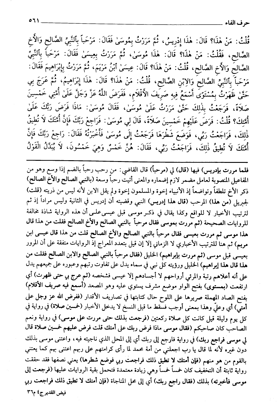 فلما مررت بإدريس) فيها (قال) لي (مرحبا) قال القاضي : من رحب رحبا بالضم إذا وسع وهو من المفاعيل المنصوبة لعامل مضمر لازم إضماره والمعنى أتيت رحبا وسعة (بالنبي الصالح والأخ الصالح) ذكر الأخ تلطفا وتواضعا إذ الأنبياء إخوة والمسلمون إخوة ولم يقل الابن لأنه ليس من ذريته (قلت) لجبريل (من هذا) المرحب (قال هذا إدريس) النبي وقضيته أن إدريس في الثانية وليس مرادا إذ ثم لترتيب الأخبار لا للواقع وكذا يقال في ذكر موسى قبل عيسى على أن هذه الرواية شاذة مخالفة للروايات الصحيحة (ثم مررت بموسى فقال مرحبا بالنبي الصالح والأخ الصالح فقلت من هذا قال هذا موسى ثم مررت بعيسى فقال مرحبا بالنبي الصالح والأخ الصالح قلت من هذا قال هذا عيسى ابن مريم) ثم هنا للترتيب الإخباري لا الزماني إلا إن قيل بتعدد المعراج إذ الروايات متفقة على أن المرور بعيسى قبل موسى (ثم مررت بإبراهيم) الخليل (فقال مرحبا بالنبي الصالح والابن الصالح فقلت من هذا قال هذا إبراهيم) الخليل ورؤيته كل نبي في السماء يدل على تفاوت رتبهم وعبوره على جميعهم يدل على أنه أعلاهم رتبة والمرئي أرواحهم لا أجسادهم إلا عيسى فشخصه (ثم عرج بي حتى ظهرت) أي ارتفعت (بمستوى) بفتح الواو موضع مشرف يستوي عليه وهو المصعد (أسمع فيه صريف الأقلام) بفتح الصاد المهملة صريرها على اللوح حال كتابتها في تصاريف الأقدار (ففرض الله عز وجل على أمتي) أي وعلي وهذا بمعنى أوجب فسقط ما قيل النسخ لا يدخل الأخبار (خمسين صلاة) في رواية في كل يوم وليلة قيل كانت كل صلاة ركعتين (فرجعت بذلك حتى مررت على موسى) في رواية ونعم الصاحب كان صاحبكم (فقال موسى ماذا فرض ربك على أمتك قلت فرض عليهم خمسين صلاة قال لى موسى فراجع ربك) في رواية فارجع إلى ربك أي إلى المحل الذي ناجيته فيه ، واعتنى موسى بذلك دون غيره لأنه لما قال يا رب اجعلني من أمة محمد لما رأى كرامتهم على ربهم اعتنى بهم كما يعتني بالقوم من هو منهم (فإن أمتك لا تطيق ذلك فراجعت ربي فوضع شطرها) يعني نصفها فقد حققت رواية ثابتة أن التخفيف كان خمسا خمسا وهي زيادة معتمدة فتحمل بقية الروايات عليها (فرجعت إلى