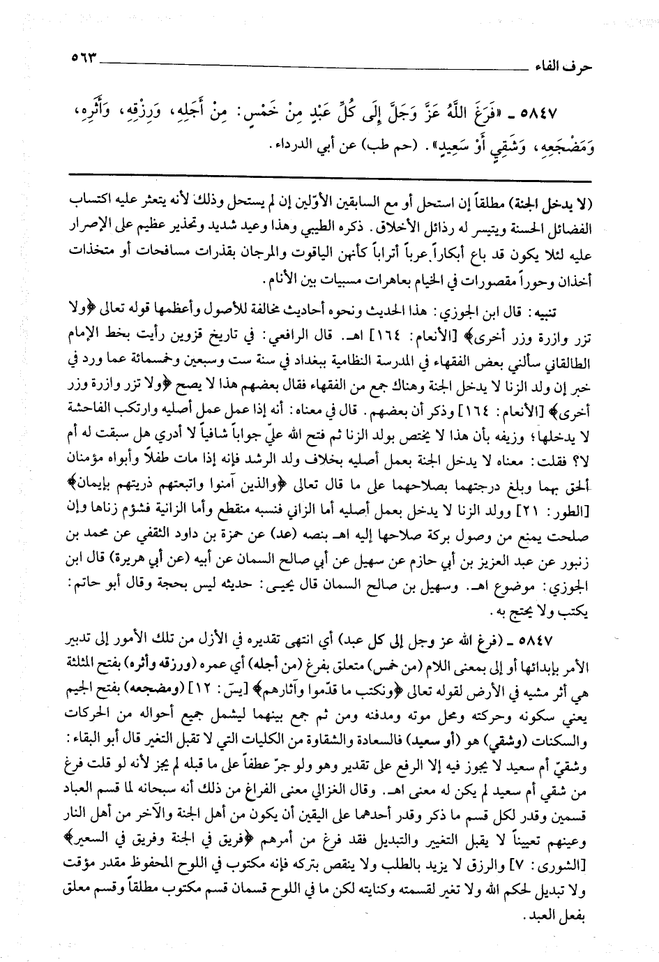 5847 - (فرغ الله عز وجل إلى كل عبد) أي انتهى تقديره في الأزل من تلك الأمور إلى تدبير الأمر بإبدائها أو إلى بمعنى اللام (من خمس) متعلق بفرغ (من أجله) أي عمره (ورزقه وأثره) بفتح المثلثة هي أثر مشيه في الأرض لقوله تعالى * (ونكتب ما قدموا وآثارهم) * (ومضجعه) بفتح الجيم يعني سكونه وحركته ومحل موته ومدفنه ومن ثم جمع بينهما ليشمل جميع أحواله من الحركات والسكنات (وشقي) هو (أو سعيد) فالسعادة أو الشقاوة من الكليات التي لا تقبل التغيير قال أبو البقاء : وشقي أم سعيد لا يجوز فيه إلا الرفع على تقدير وهو ولو جر عطفا على ما قبله لم يجز لأنه لو قلت فرغ من شقي أم سعيد لم يكن له معنى اه.