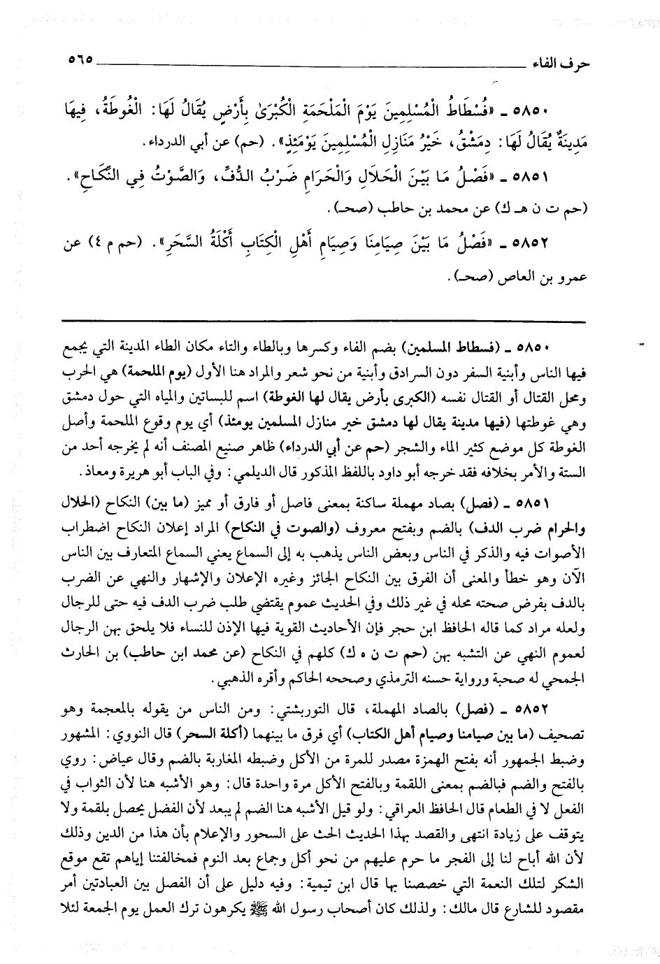 5850 - (فسطاط المسلمين) بضم الفاء وكسرها وبالطاء والتاء مكان الطاء المدينة التي يجمع فيها الناس وأبنية السفر دون السرادق وأبنية من نحو شعر والمراد هنا الأول (يوم الملحمة) هي الحرب ومحل القتال أو القتال نفسه (الكبرى بأرض يقال لها الغوطة) اسم للبساتين والمياه التي حول دمشق وهي غوطتها (فيها مدينة يقال لها دمشق خير منازل المسلمين يومئذ) أي يوم وقوع الملحمة وأصل