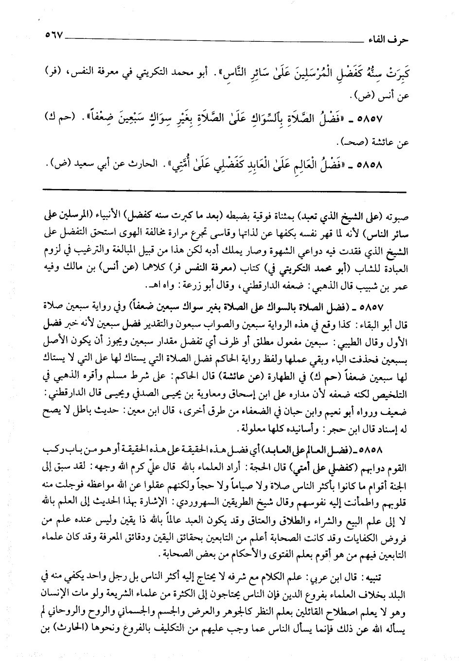 5858 - (فضل العالم على العابد) أي فضل هذه الحقيقة على هذه الحقيقة أو هو من باب ركب القوم دوابهم (كفضلي على أمتي) قال الحجة : أراد العلماء بالله قال علي كرم الله وجهه : لقد سبق إلى الجنة أقوام ما كانوا بأكثر الناس صلاة ولا صياما ولا حجا ولكنهم عقلوا عن الله مواعظه فوجلت منه قلوبهم واطمأنت إليه نفوسهم وقال شيخ الطريقين السهروردي : الإشارة بهذا الحديث إلى العلم بالله لا إلى علم البيع والشراء والطلاق والعتاق وقد يكون العبد عالما بالله ذا يقين وليس عنده علم من فروض الكفايات وقد كانت الصحابة أعلم من التابعين بحقائق اليقين ودقائق المعرفة وقد كان علماء التابعين فيهم من هو أقوم بعلم الفتوى والأحكام من بعض الصحابة (تنبيه) قال ابن عربي : علم الكلام مع شرفه لا يحتاج إليه أكثر الناس بل رجل واحد يكفي منه في البلد بخلاف العلماء بفروع الدين فإن الناس يحتاجون إلى الكثرة من علماء الشريعة ولو مات الإنسان وهو لا يعلم اصطلاح القائلين بعلم النظر كالجوهر والعرض والجسم والجسماني والروح والروحاني لم يسأله الله عن ذلك فإنما يسأل الناس عما وجب عليهم من التكليف بالفروع ونحوها.