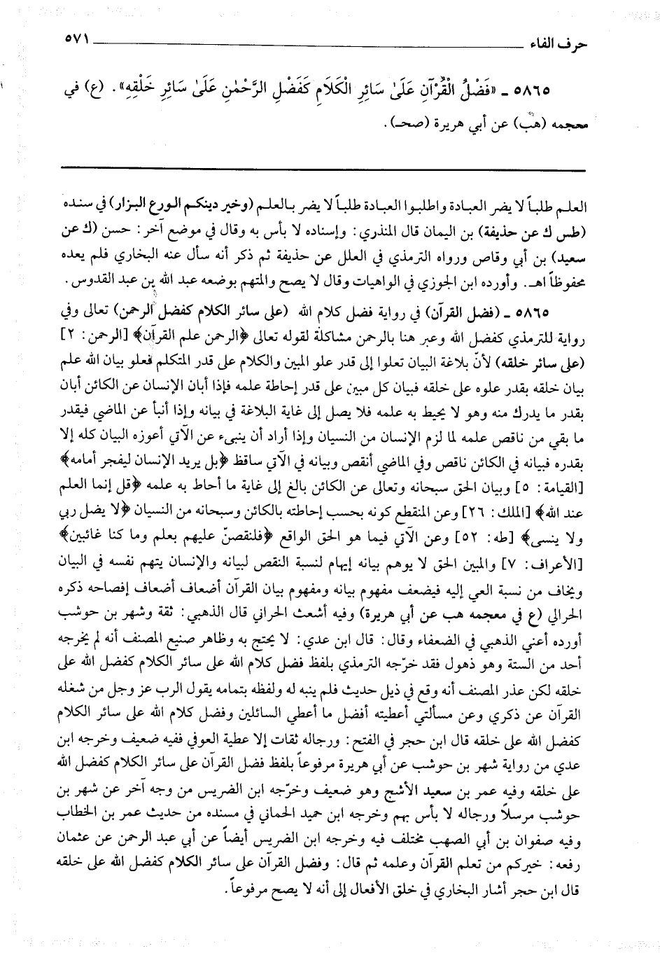 وفيه صفوان بن أبي الصهب مختلف فيه وخرجه ابن الضريس أيضا عن أبي عبد الرحمن السلمي عن عثمان رفعه خيركم من تعلم القرآن وعلمه ثم قال : وفضل القرآن على سائر الكلام كفضل الله على خلقه قال ابن حجر : أشار البخاري في خلق الأفعال إلى أنه لا يصح مرفوعا.