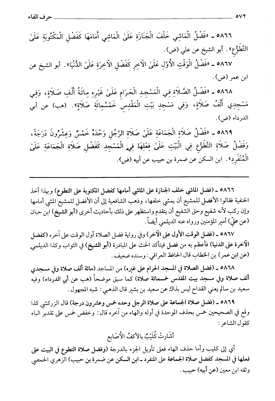 5869 - (فضل صلاة الجماعة على صلاة الرجل وحده خمس وعشرون درجة) قال الزركشي : كذا وقع في الصحيحين خمس بحذف الموحدة في أوله والهاء من آخره قال : وخفض خمس على تقدير الباء كقول الشاعر : أشارت كليب بالأكف الأصابع * أي إلى كليب وأما حذف الهاء فعلى تأويل الجزء بالدرجة (وفضل صلاة التطوع في البيت على فعلها في المسجد كفضل صلاة الجماعة على صلاة المنفرد.