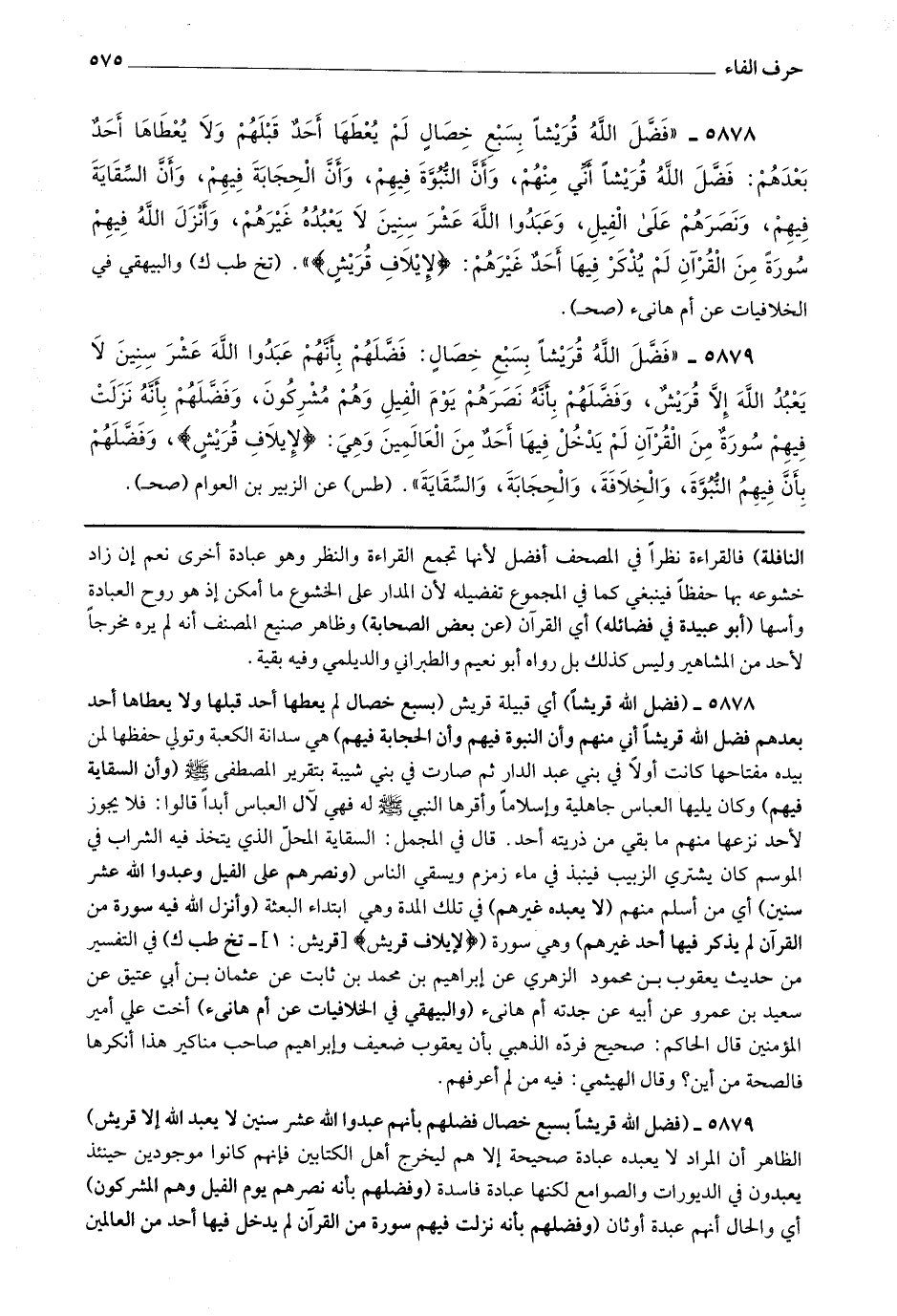 5879 - (فضل الله قريشا بسبع خصال فضلهم بأنهم عبدوا الله عشر سنين لا يعبد الله إلا قريش) الظاهر أن المراد لا يعبده عبادة صحيحة إلا هم ليخرج أهل الكتابين فإنهم كانوا موجودين حينئذ يعبدون في الديورات والصوامع لكنها عبادة فاسدة (وفضلهم بأنه نصرهم يوم الفيل وهم مشركون) أي والحال أنهم عبدة أوثان (وفضلهم بأنه نزلت فيه سورة من القرآن لم يدخل فيها أحد من العالمين