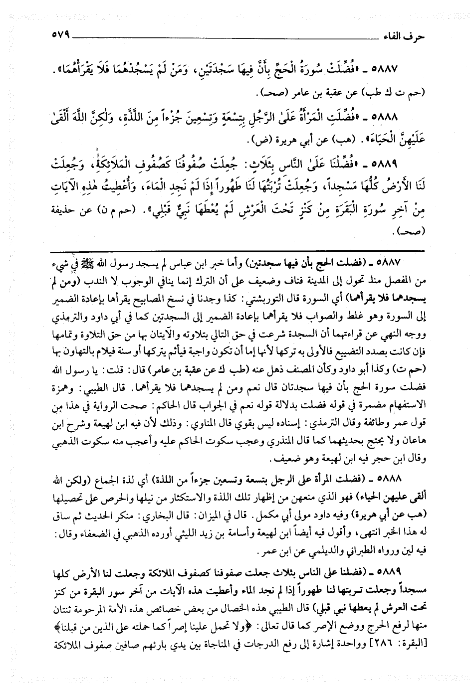 (حم ت) وكذا أبو داود وكأن المصنف ذهل عنه (طب ك عن عقبة بن عامر) قال : قلت يا رسول الله فضلت سورة الحج بأن فيها سجدتان قال : نعم ومن لم يسجدهما فلا يقرأهما قال الطيبي : وهمزة الاستفهام مضمرة في قوله فضلت بدلالة قوله نعم في الجواب قال الحاكم : صحت الرواية في هذا من قول عمر وطائفة وقال الترمذي : إسناده ليس بقوي قال المناوي : وذلك لأن فيه ابن لهيعة وشرح ابن هاعان ولا يحتج بحديثهما كما قال المنذري وعجب سكوت الحاكم عليه وأعجب منه سكوت الذهبي وقال ابن حجر فيه ابن لهيعة وهو ضعيف.