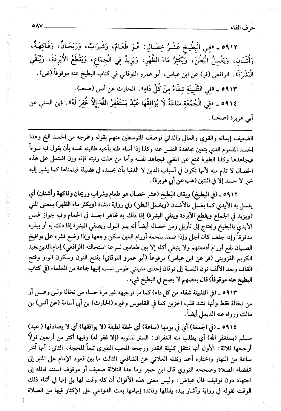 5913 - (في التلبينة شفاء من كل داء) كما مر توجيهه غير مرة حساء من نخالة ولبن وعسل أو من نخالة فقط وأنها تشد قلب الحزين كما في القاموس وغيره.