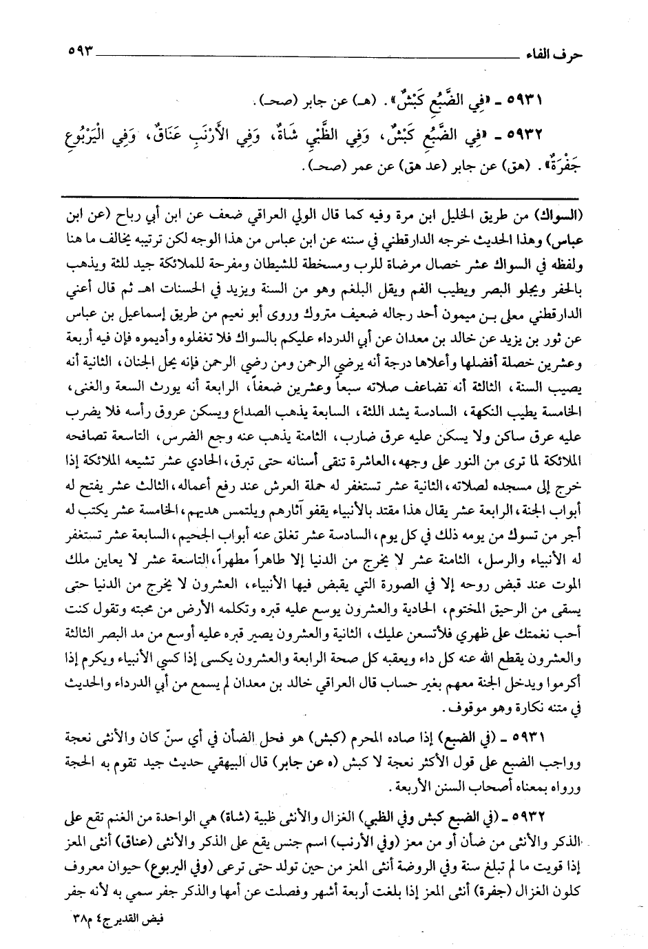 5932 - (في الضبع كبش وفي الظبي) الغزال والأنثى ظبية (شاة) هي الواحدة من الغنم تقع على الذكر والأنثى من ضأن أو معز (وفي الأرنب) اسم جنس يقع على الذكر والأنثى (عناق) أنثى المعز إذا قويت ما لم تبلغ سنة وفي الروضة أنثى المعز من حين تولد حتى ترعى (وفي اليربوع) حيوان معروف كلون الغزال (جفرة) أنثى المعز إذا بلغت أربعة أشهر وفصلت عن أمها والذكر جفر سمي به لأنه جفر