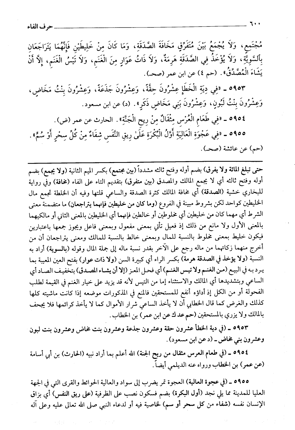 حتى تبلغ المائة ولا يفرق) بضم أوله وفتح ثالثه مشددا (بين مجتمع) بكسر الميم الثانية (ولا يجمع) بضم أوله وفتح ثالثه أي لا يجمع المالك والمصدق (بين متفرق) بتقديم التاء على الفاء (مخافة) وفي رواية للبخاري خشية (الصدقة) أي مخافة المالك كثرة الصدقة والساعي قلتها وفيه أن الخلطة تجمع مال الخليطين كواحد لكن بشروط مبينة في الفروع (وما كان من خليطين فإنهما يتراجعان) ما متضمنة معنى الشرط أي مهما كان من خليطين أي مخلوطين أو خالطين فإنهما أي الخليطين بالمعنى الثاني أو مالكيهما
