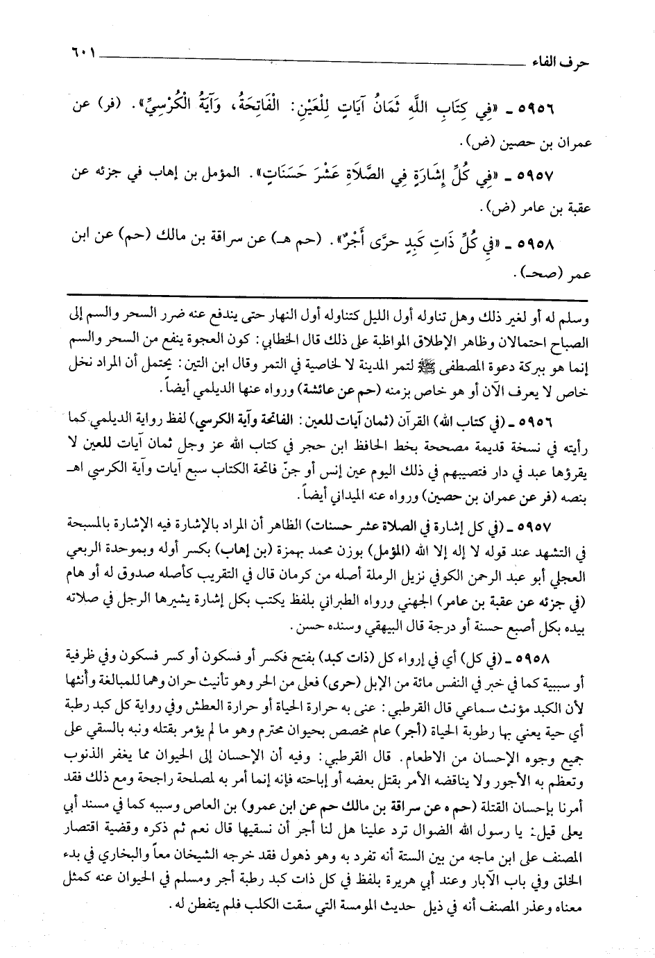 5956 - (في كتاب الله) القرآن (ثمان آيات للعين : الفاتحة وآية الكرسي) لفظ رواية الديلمي كما رأيته في نسخة قديمة مصححة بخط الحافظ ابن حجر في كتاب الله عز وجل ثمان آيات للعين لا يقرؤها عبد في دار فتصيبهم في ذلك اليوم عين إنس أو جن فاتحة الكتاب سبع آيات وآية الكرسي اه بنصه.