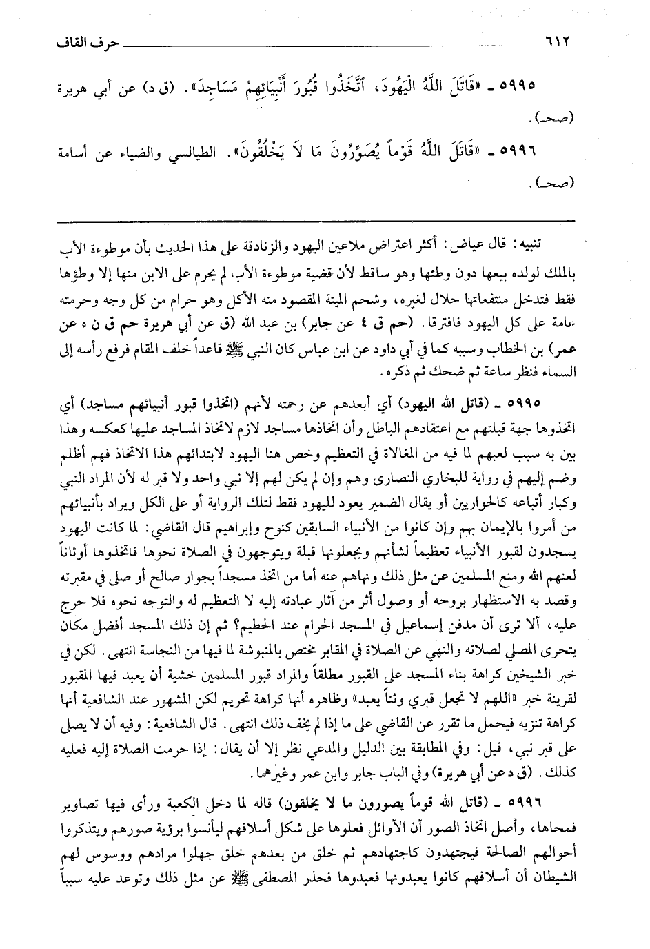 5995 - (قاتل الله اليهود) أي أبعدهم عن رحمته لأنهم (اتخذوا قبور أنبيائهم مساجد) أي اتخذوها جهة قبلتهم مع اعتقادهم الباطل وأن اتخاذها مساجد لازم لاتخاذ المساجد عليها كعكسه وهذا بين به سبب لعنهم لما فيه من المغالاة في التعظيم وخص هنا اليهود لابتدائهم هذا الاتخاذ فهم أظلم وضم إليهم في رواية للبخاري النصارى وهم وإن لم يكن لهم إلا نبي واحد ولاقبر له لأن المراد النبي وكبار أتباعه كالحواريين أو يقال الضمير يعود لليهود فقط لتلك الرواية أو على الكل ويراد بأنبيائهم من أمروا بالإيمان بهم وإن كانوا من الأنبياء السابقين كنوح وإبراهيم قال القاضي : لما كانت اليهود يسجدون لقبور الأنبياء تعظيما لشأنهم ويجعلونها قبلة ويتوجهون في الصلاة نحوها فاتخذوها أوثانا لعنهم الله ومنع المسلمين عن مثل ذلك ونهاهم عنه أما من اتخذ مسجدا بجوار صالح أو صلى في مقبرته وقصد به الاستظهار بروحه أو وصول أثر من آثار عبادته إليه لا التعظيم له والتوجه نحوه فلا حرج عليه ، ألا ترى أن مدفن إسماعيل في المسجد الحرام عند الحطيم ؟ ثم إن ذلك المسجد أفضل مكان يتحرى المصلي لصلاته والنهي عن الصلاة في المقابر مختص بالمنبوشة لما فيها من النجاسة انتهى لكن في خبر الشيخين كراهة بناء المسجد على القبور مطلقا والمراد قبور المسلمين خشية أن يعبد فيها المقبور لقرينة خبر اللهم لا تجعل قبري وثنا يعبد وظاهره أنها كراهة تحريم لكن المشهور عند الشافعية أنها كراهة تنزيه فيحمل ما تقرر عن القاضي على ما إذا لم يخف ذلك انتهى قال الشافعية وفيه أن لا يصلى على قبر نبي قيل وفي المطابقة بين الدليل والمدعي نظر إلا أن يقال إذا حرمت الصلاة إليه فعليه كذلك.