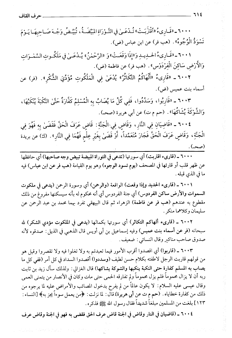 6001 - (قارئ الحديد وإذا وقعت) الواقعة (والرحمن) أي وسورة الرحمن (يدعى في ملكوت السماوات والأرض ساكن الفردوس) أي جنة الفردوس أي أنه محكوم له بأنه سيسكنها مفروغ من ذلك مقطوع به عندهم.