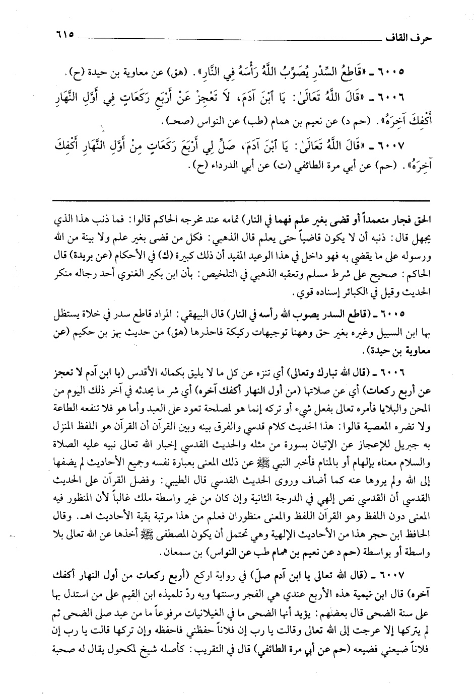 6007 - (قال الله تعالى يا ابن آدم صل) في رواية اركع (أربع ركعات من أول النهار أكفك آخره) قال ابن تيمية : هذه الأربعة عندي هي الفجر وسننها وبه رد تلميذه ابن القيم على من استدل بها على سنة الضحى.
