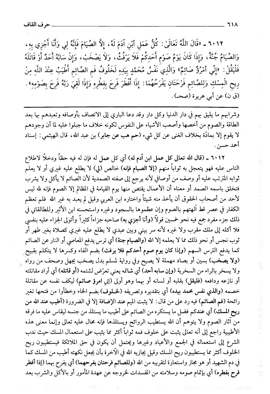 6012 - (قال الله تعالى كل عمل ابن آدم له) أي كل عمل له فإن له فيه حظا ودخلا لإطلاع الناس عليه فهو يتعجل به ثوابا منهم (إلا الصيام فإنه) خالص (لي) لا يطلع عليه غيري أو لا يعلم ثوابه المترتب عليه أو وصف من أوصافي لأنه يرجع إلى صفته الصمدية لأن الصائم لا يأكل ولا يشرب فتخلق باسمه الصمد أو معناه أن الأعمال يقتص منها يوم القيامة في المظالم إلا الصوم فإنه لله ليس لأحد من أصحاب الحقوق أن يأخذ منه شيئا واختاره ابن العربي وقيل لم يعبد به غير الله فلم تعظم الكفار في عصر قط آلهتهم بالصوم وإن عظموها بالسجود وغيره واستحسنه ابن الأثير وللطالقاني في ذلك جزء مفرد جمع فيه نحو خمسين قولا (وأنا أجزي به) صاحبه جزاءا كثيرا وأتولى الجزاء عليه بنفسي فلا أكله إلى ملك مقرب ولا غيره لأنه سر بيني وبين عبدي لا يطلع عليه غيري كصلاة بغير طهر أو ثوب نجس أو نحو ذلك مما لا يعلمه إلا الله (والصيام جنة) أي ترس يدفع المعاصي أو النار عن الصائم كما يدفع الترس السهم (وإذا كان يوم صوم أحدكم فلا يرفث) بضم الفاء وكسرها لا يتكلم بقبيح (ولا يصخب) بسين أو بصاد مهملة لا يصيح وفي رواية لمسلم بدل يصخب يجهل وصحف من رواه ولا يسخر بالراء من السخرية (وإن سابه أحد) أي شاتمه يعني تعرض لشتمه (أو قاتله) أي أراد مقاتلته أو نازعه ودافعه (فليقل) بقلبه أو لسانه أو بهما وهو أولى (إني امرؤ صائم) ليكف نفسه عن مقاتلة خصمه (والذي نفس محمد بيده) أي بتقديره وتصريفه (لخلوف) بضم الخاء وخطأوا من فتحها تغير رائحة (فم الصائم) فيه رد على من قال لا تثبت الميم عند الإضافة إلا في الضرورة (أطيب عند الله من ريح المسك) أي عندكم فضل ما يستكره من الصائم على أطيب ما يستلذ من جنسه ليقاس عليه ما فوقه من آثار الصوم ولا يتوهم أن الله يستطيب الروائح ويستلذ ما فإنه محال عليه تعالى وإنما معنى هذه الأطيبية راجع إلى أنه تعالى يثيب على خلوف فمه ثوابا أكثر مما يثيب على استعمال المسك حيث ندب الشرع إلى استعماله في الجمع والأعياد وغيرها ويحتمل أن يكون في حق الملائكة فيستطيبون ريح الخلوف أكثر مما يستطيبون ريح المسك وقيل يجازيه الله في الآخرة بأن يجعل نكهته أطيب