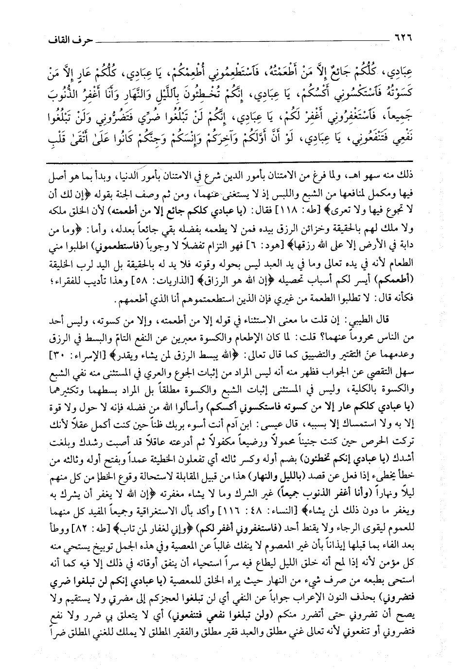 قال الطيبي : إن قلت ما معنى الاستثناء في قوله إلا من أطعمته ، وإلا من كسوته ، وليس أحد من الناس محروما عنهما ؟ قلت لما كان الإطعام والكسوة معبرين عن النفع التام والبسط في الرزق وعدمهما عن التقتير والتضييق كما قال تعالى * (الله يبسط الرزق لمن يشاء ويقدر) * سهل التقصي عن الجواب فظهر منه أنه ليس المراد من إثبات الجوع والعري في المستثنى منه نفي الشبع والكسوة بالكلية ، وليس في المستثنى إثبات الشبع والكسوة مطلقا بل المراد بسطهما وتكثيرهما (يا عبادي كلكم عار إلا من كسوته فاستكسوني أكسكم) واسألوا الله من فضله فإنه لا حول ولا قوة إلا به ولا استمساك إلا بسببه ، قال عيسى : ابن آدم أنت أسوأ بربك ظنا حين كنت أكمل عقلا لأنك تركت الحرص حين كنت جنينا محمولا ورضيعا مكفولا ثم أدرعته عاقلا قد أصبت رشدك وبلغت أشدك (يا عبادي إنكم تخطئون) بضم أوله وكسر ثالثه أي تفعلون الخطيئة عمدا وبفتح أوله وثالثه من خطأ يخطئ إذا فعل عن قصد (بالليل والنهار) هذا من قبيل المقابلة لاستحالة وقوع الخطأ من كل منهم ليلا ونهارا (وأنا أغفر الذنوب جميعا) غير الشرك وما لا يشاء مغفرته * (إن الله لا يغفر أن يشرك به