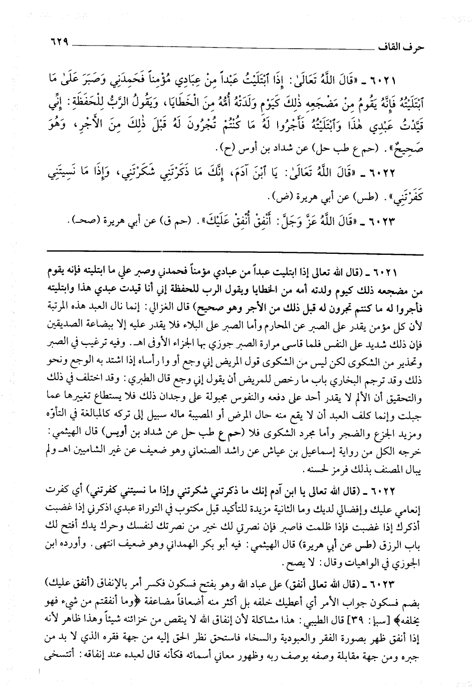 6021 - (قال تعالى إذا ابتليت عبدا من عبادي مؤمنا فحمدني وصبر على ما ابتليته فإنه يقوم من مضجعه ذلك كيوم ولدته أمه من الخطايا ويقول الرب للحفظة إني أنا قيدت عبدي وابتليته فأجروا له ما كنتم تجرون له قبل ذلك من الأجر وهو صحيح) قال الغزالي : إنما نال العبد هذه المرتبة لأن كل مؤمن يقدر على الصبر على المحارم وأما الصبر على البلاء فلا يقدر عليه إلا ببضاعة الصديقين فإن ذلك شديد على النفس فلما قاسى مرارة الصبر جوزي بها الجزاء الأوفى اه.