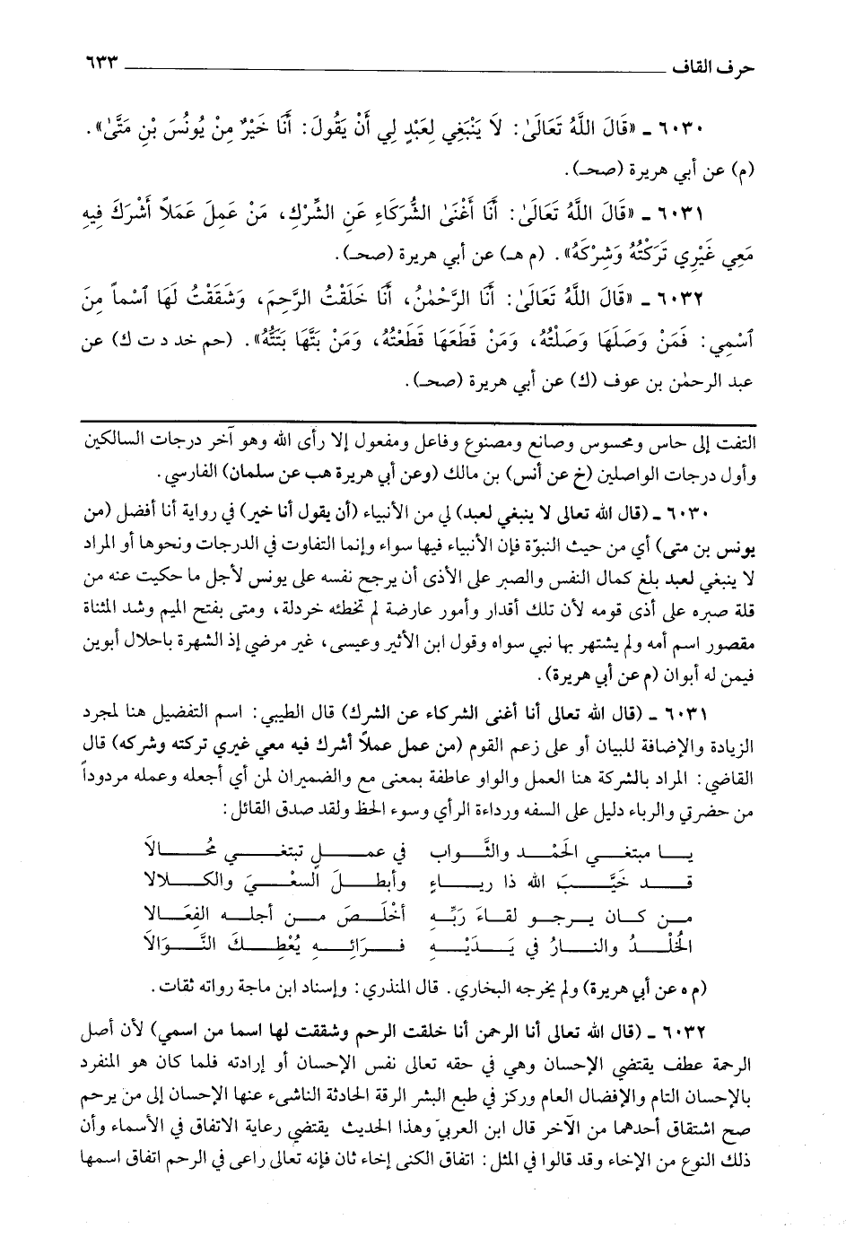 6032 - (قال الله تعالى أنا الرحمن أنا خلقت الرحم وشققت لها اسما من اسمي) لأن أصل الرحمة عطف يقتضي الإحسان وهي في حقه تعالى نفس الإحسان أو إرادته فلما كان هو المنفرد بالإحسان التام والإفضال العام وركز في طبع البشر الرقة الحادثة الناشئ عنها الإحسان إلى من يرحم صح اشتقاق أحدهما من الآخر قال ابن العربي : وهذا الحديث يقتضي رعاية الاتفاق في الأسماء وأن ذلك النوع من الإخاء وقد قالوا في المثل : اتفاق الكنى إخاء ثان فإنه تعالى راعى في الرحم اتفاق اسمها