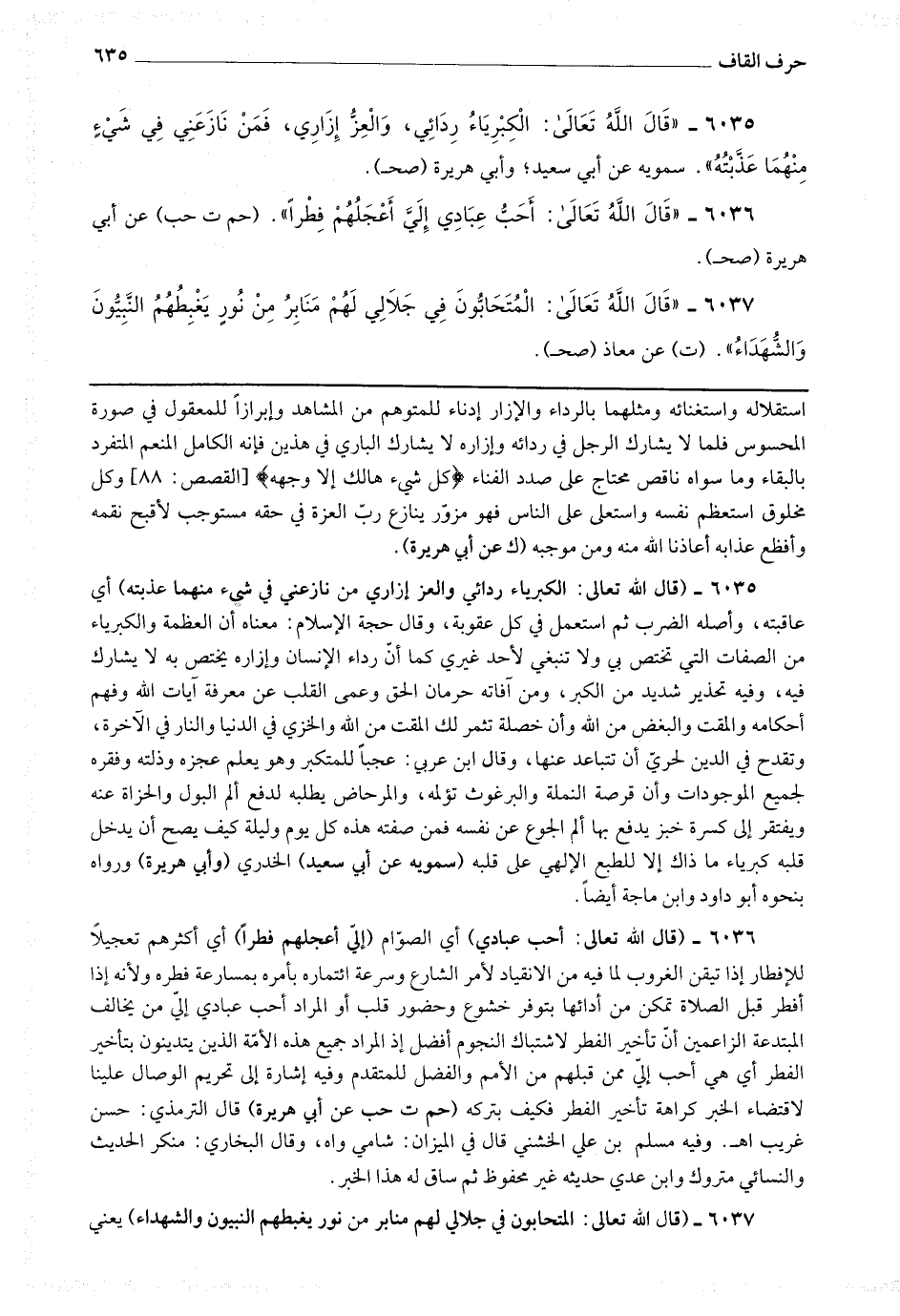 6035 - (قال الله تعالى : الكبرياء ردائي والعز إزاري من نازعني في شئ منهما عذبته) أي عاقبته وأصله الضرب ثم استعمل في كل عقوبة ، وقال حجة الإسلام : معناه أن العظمة والكبرياء من الصفات التي تختص بي ولا تنبغي لأحد غيري كما أن رداء الإنسان وإزاره يختص به لا يشارك فيه ، وفيه تحذير شديد من الكبر ، ومن آفاته حرمان الحق وعمى القلب عن معرفة آيات الله وفهم أحكامه والمقت والبغض من الله وأن خصلة تثمر لك المقت من الله والخزي في الدنيا والنار في الآخرة ، وتقدح في الدين لحري أن تتباعد عنها ، وقال ابن عربي : عجبا للمتكبر وهو يعلم عجزه وذلته وفقره لجميع الموجودات وأن قرصة النملة والبرغوث تؤلمه ، والمرحاض يطلبه لدفع ألم البول والحزاة عنه ويفتقر إلى كسرة خبز يدفع بها ألم الجوع عن نفسه فمن صفته هذه كل يوم وليلة كيف يصح أن يدخل قلبه كبرياء ما ذاك إلا للطبع الإلهي على قلبه.