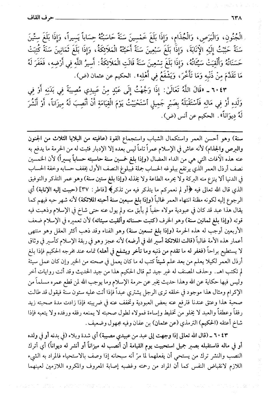 لم تكتب اه وحذف المصنف له غير جيد ثم قال الحكيم : هذا من جيد الحديث وقد أتت روايات أخر وليس فيها حكاية عن الله وهذا حديث يخبر عن حرمة الإسلام وما يوجب الله لمن قطع عمره مسلما من الإكرام ومثال هذا موجود في خلقه ترى الرجل يشتري عبدا فإذا أتت عليه ستون سنة فيقول قد طالت صحبة هذا وعتق عندنا فترفع عنه بعض العبودية وتخفف عنه في ضريبته فإذا زادت مدة صحبته زيد رفقا وعطفا والعبد لا يخلو من تخليط وإساءة فمولاه لطول صحبته لا يمنعه رفقه ورفده ولا يتعبه فإذا شاخ أعتقه.