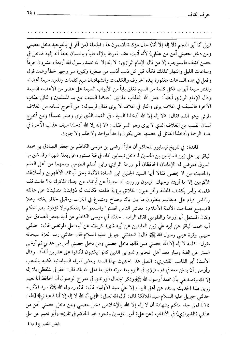 وساعات الليل والنهار كذلك فكأنه قيل كل ذنب أذنب من صغيرة وكبيرة سر وجهر خطأ وعمد قول وفعل في هذه الساعات مغفورة بهذه الحروف والكلمات والشهادتان سبع كلمات وللعبد سبعة أعضاء وللنار سبعة أبواب فكل كلمة من السبع تغلق بابا من الأبواب السبعة على عضو من الأعضاء السبعة وقال الإمام الرازي أيضا : جعل الله العذاب عذابين أحدهما السيف من يد المسلمين والثاني عذاب الآخرة فالسيف في غلاف يرى والنار في غلاف لا يرى فقال لرسوله من أخرج لسانه من الغلاف المرئي وهو الفم فقال لا إله إلا الله أدخلنا السيف في الغمد الذي يرى وصار محسنا ومن أخرج لسان القلب من الغلاف الذي لا يرى وهو السر فقال لا إله إلا الله أدخلنا سيف عذاب الآخرة في غمد الرحمة وأدخلنا القائل في حصنها حتى يكون واحدا بواحد ولا ظلم ولا جور (فائدة) في تاريخ نيسابور للحاكم أن عليا الرضى بن موسى الكاظم بن جعفر الصادق بن محمد الباقر بن علي زين العابدين بن الحسين لما دخل نيسابور كان في قبة مستورة على بغلة شهباء وقد شق بها السوق فعرض له الإمامان الحافظان أبو زرعة الرازي وابن أسلم الطوسي ومعهما من أهل العلم والحديث من لا يحصى فقالا أيها السيد الجليل ابن السادة الأئمة بحق آبائك الأطهرين وأسلافك الأكرمين إلا ما أريتنا وجهك الميمون ورويت لنا حديثا عن آبائك عن جدك نذكرك به ؟ فاستوقف غلمانه وأمر بكشف المظلة وأقر عيون الخلائق برؤية طلعته فكانت له ذؤابتان متدليتان على عاتقه والناس قيام على طبقاتهم ينظرون ما بين باك وصاخ ومتمرغ في التراب ومقبل لحافر بغلته وعلا الضجيج فصاحت الأئمة الأعلام : معاشر الناس انصتوا واسمعوا ما ينفعكم ولا تؤذونا بصراخكم وكان المستملي أبو زرعة والطوسي فقال الرضى حدثنا أبي موسى الكاظم عن أبيه جعفر الصادق عن أبيه محمد الباقر عن أبيه علي زين العابدين عن أبيه شهيد كريلاء عن أبيه على المرتضى قال حدثني حبيبي وقرة عيني رسول الله صلى الله عليه وسلم قال حدثني جبريل عليه السلام قال حدثني رب العزة سبحانه يقول كلمة لا إله إلا الله حصني فمن قالها دخل حصني ومن دخل حصني أمن من عذابي ثم أرخى الستر على القبة وسار فعد أهل المحابر والدواين الذين كانوا يكتبون فأنافوا على عشرين ألفا.