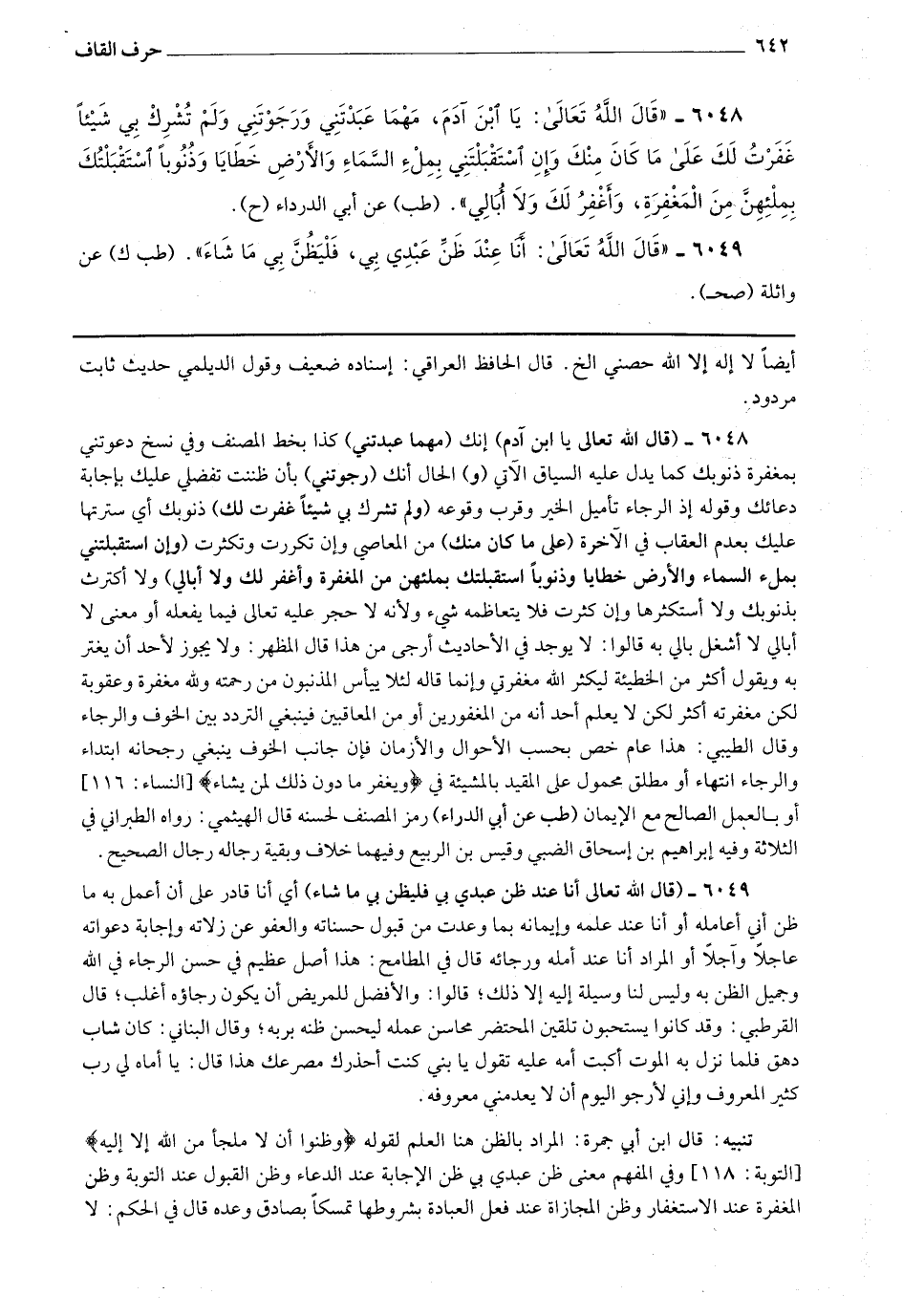 6048 - (قال الله تعالى يا ابن آدم) إنك (مهما عبدتني) كذا بخط المصنف وفي نسخ دعوتني بمغفرة ذنوبك كما يدل عليه السياق الآتي (و) الحال أنك (رجوتني) بأن ظننت تفضلي عليك بإجابة دعائك وقوله إذ الرجاء تأميل الخير وقرب وقوعه (ولم تشرك بي شيئا غفرت لك) ذنوبك أي سترتها عليك بعدم العقاب في الآخرة (على ما كان منك) من المعاصي وإن تكررت وتكثرت (وإن استقبلتني بملء السماء والأرض خطايا وذنوبا استقبلتك بملئهن من المغفرة وأغفر لك ولا أبالي) ولا أكترث بذنوبك ولا أستكثرها وإن كثرت فلا يتعاظمه شئ ولأنه لا حجر عليه تعالى فيما يفعله أو معنى لا أبالي لا أشغل بالي به قالوا : لا يوجد في الأحاديث أرجى من هذا قال المظهر : ولا يجوز لأحد أن يغتر به ويقول أكثر من الخطيئة ليكثر الله مغفرتي وإنما قاله لئلا ييأس المذنبون من رحمته ولله مغفرة وعقوبة لكن مغفرته أكثر لكن لا يعلم أحد أنه من المغفورين أو من المعاقبين فينبغي التردد بين الخوف والرجاء وقال الطيبي : هذا عام خص بحسب الأحوال والأزمان فإن جانب الخوف ينبغي رجحانه ابتداء والرجاء انتهاء أو مطلق محمول على المقيد بالمشيئة في (ويغفر ما دون ذلك لمن يشاء) أو بالعمل الصالح مع الإيمان.