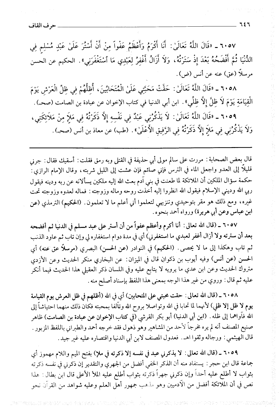 6059 - (قال الله تعالى لا يذكرني عبد في نفسه إلا ذكرته في ملأ) بفتح الميم واللام مهموز أي جماعة قال ابن حجر : يستفاد منه أن الذكر الخفي أفضل من الجهري والتقدير إن ذكرني في نفسه ذكرته بثواب لا أطلع عليه أحدا وإن ذكرني جهرا ذكرته بثواب أطلع عليه الملأ الأعلى قال ابن بطال : هذا نص في أن الملائكة أفضل من الآدميين وهو مذهب جمهور أهل العلم وعليه شواهد من القرآن نحو
