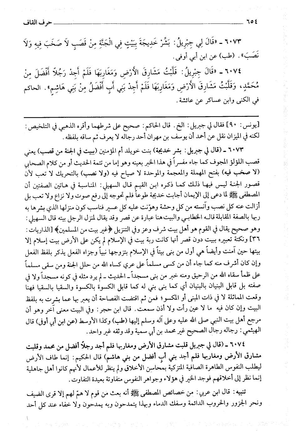 6073 - (قال لي جبريل بشر خديجة) بنت خويلد أم المؤمنين (ببيت في الجنة من قصب) يعني قصب اللؤلؤ المجوف كما جاء مفسرا في هذا الخبر بعينه وهو إما من تتمة الحديث أو من كلام الصحابي (لا صخب فيه) بفتح المهملة والمعجمة والموحدة لا صياح فيه (ولا نصب) بالتحريك لا تعب لأن قصور الجنة ليس فيها ذلك كما ذكره ابن القيم قال السهيلي : المناسبة في هاتين الصفتين أن المصطفى صلى الله عليه وسلم لما دعى إلى الإيمان أجابت خديجة طوعا فلم تحوجه إلى رفع صوت ولا نزاع ولا تعب بل أزالت عنه كل نصب وآنسته من كل وحشة وهونت عليه كل عسير فناسب كون منزلها الذي بشرها به ربها بالصفة المقابلة قال الخطابي : والبيت هنا عبارة عن قصر وقد يقال لمنزل الرجل بيته قال السهيلي : وهو صحيح يقال في القوم هو أهل بيت شرف وعزو في التنزيل * (غير بيت من المسلمين) * ونكتة تعبيره ببيت دون قصر أنها كانت ربة بيت في الإسلام لم يكن على الأرض بيت إسلام إلا بيتها حين آمنت وأيضا هي أول من بنى بيتا في الإسلام بتزوجها نبيا وجزاه الفعل يذكر بلفظ الفعل وإن كان أشرف منه كما جاء أن من كسى مسلما على عري كساه الله من حلل الجنة ومن سقى مسلما على ظمأ سقاه الله من الرحيق ومنه خبر من بنى مسجدا - الحديث - لم يرد مثله في كونه مسجدا ولا في